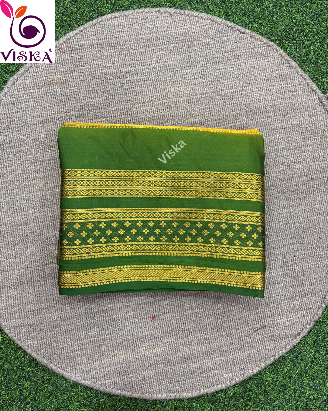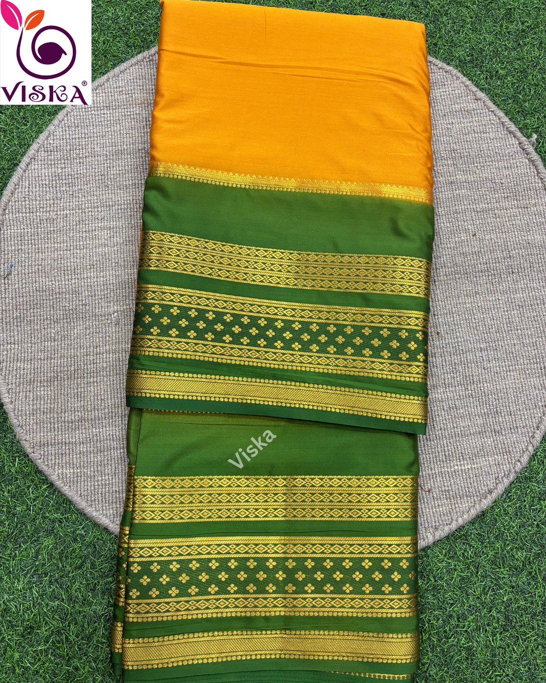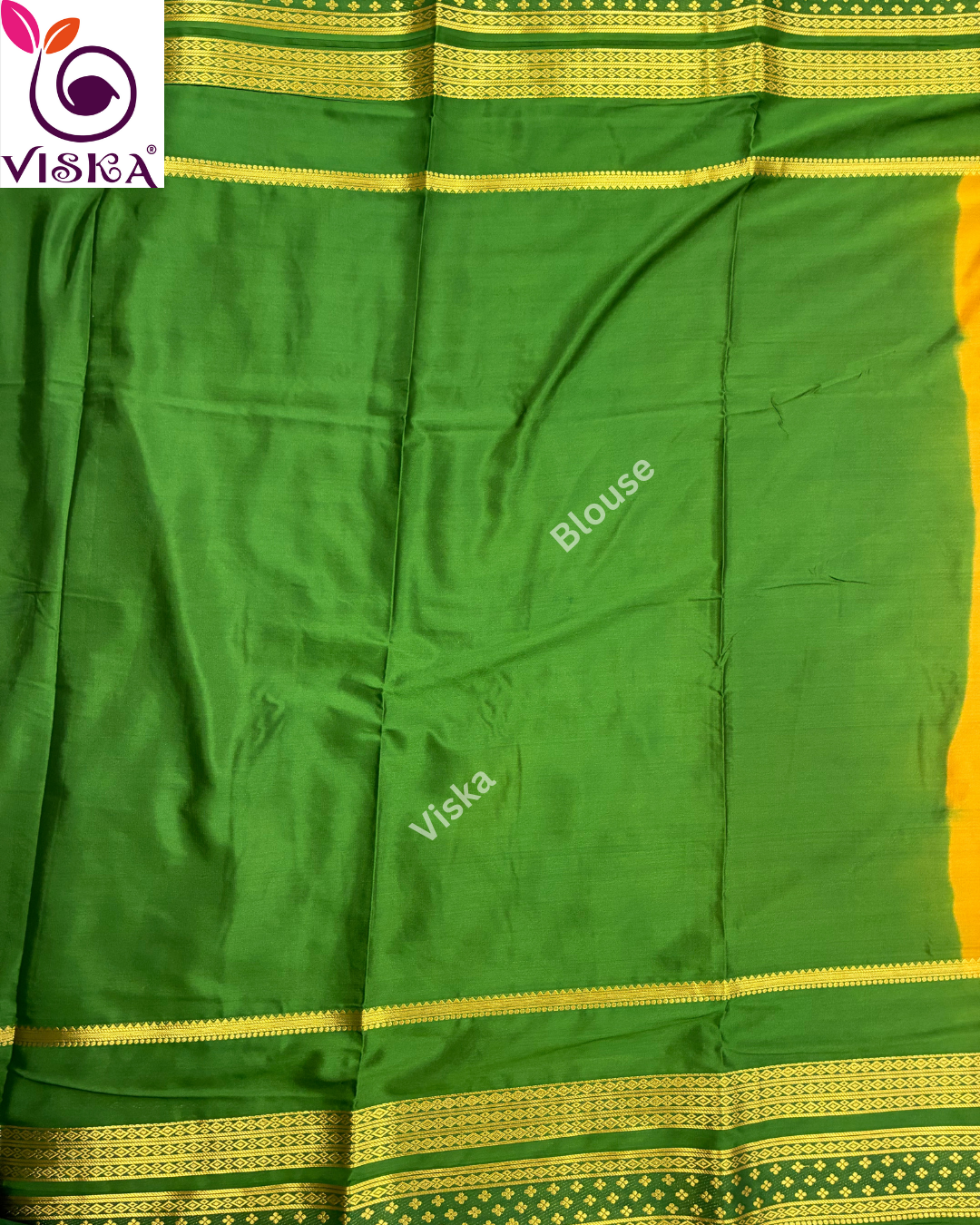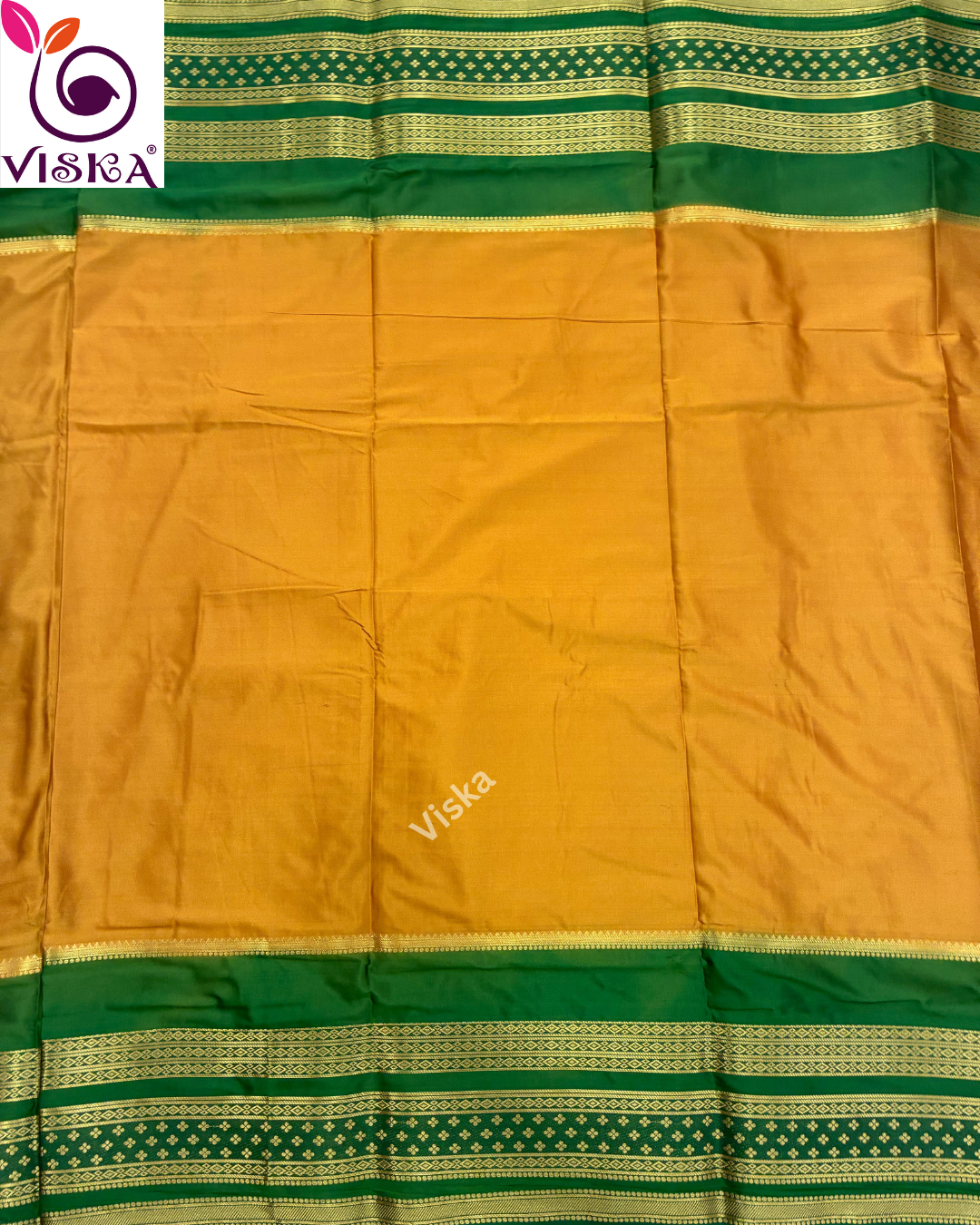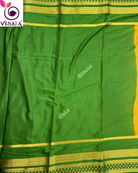 This saree is made of Mysore crepe silk in a rich Mustard Yellow and Green Color.