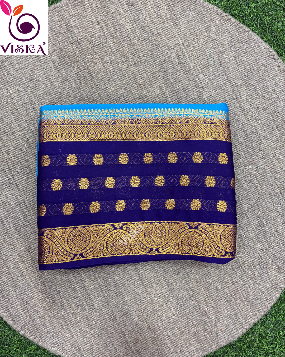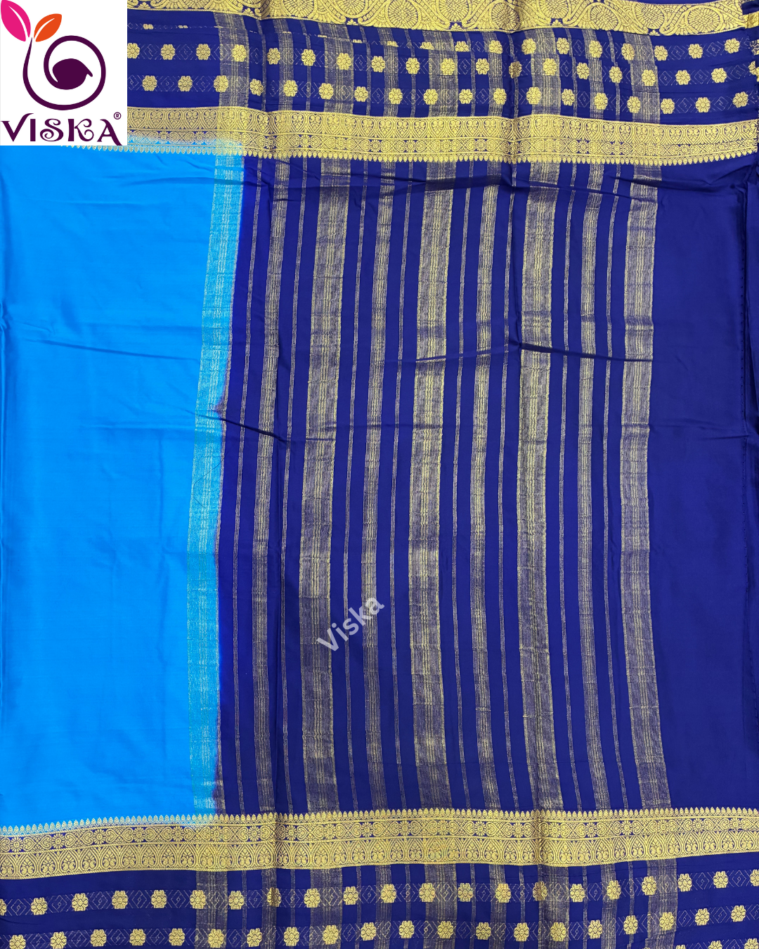 This saree is made of Mysore crepe silk in a Sky Blue and Royal Blue with Butta Border.