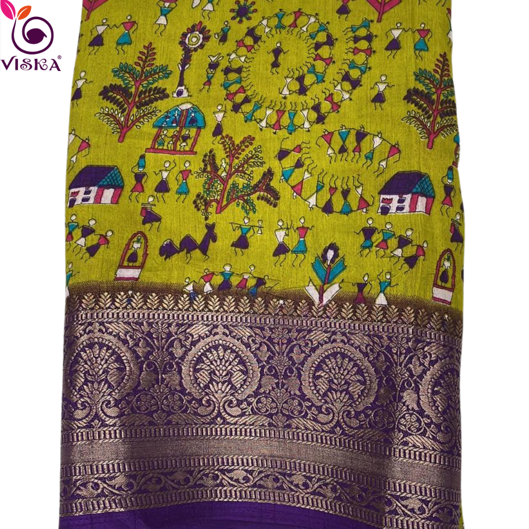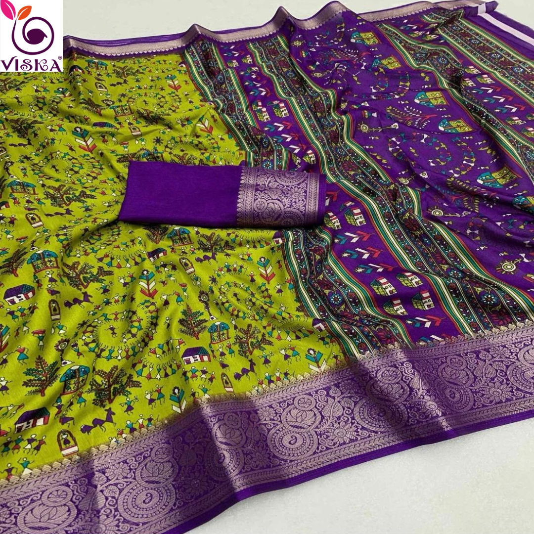 Green with purple warli design Semi dola saree