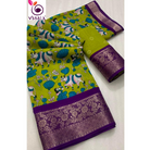 This semi dola saree features a Pichwai design in shades of green and purple.