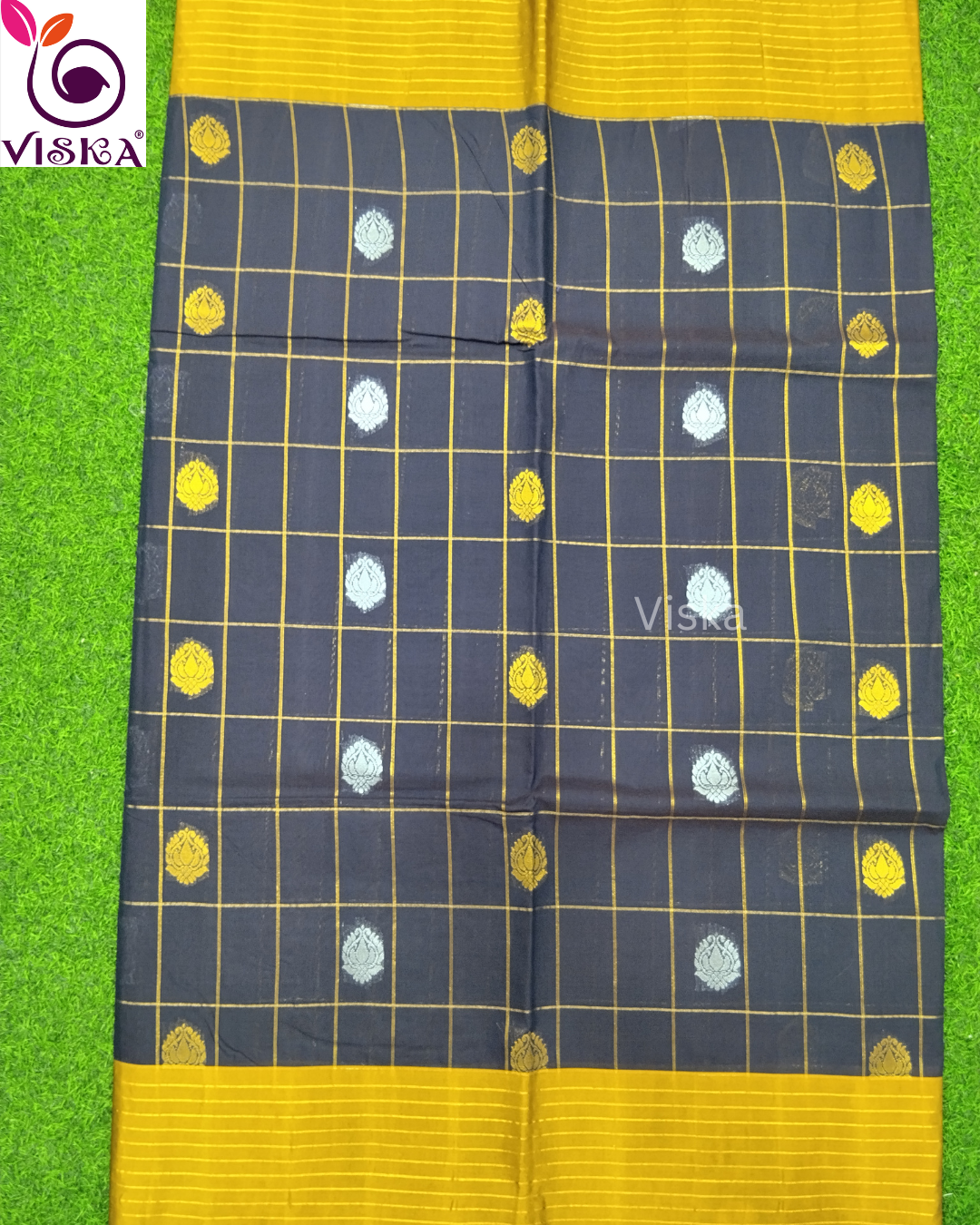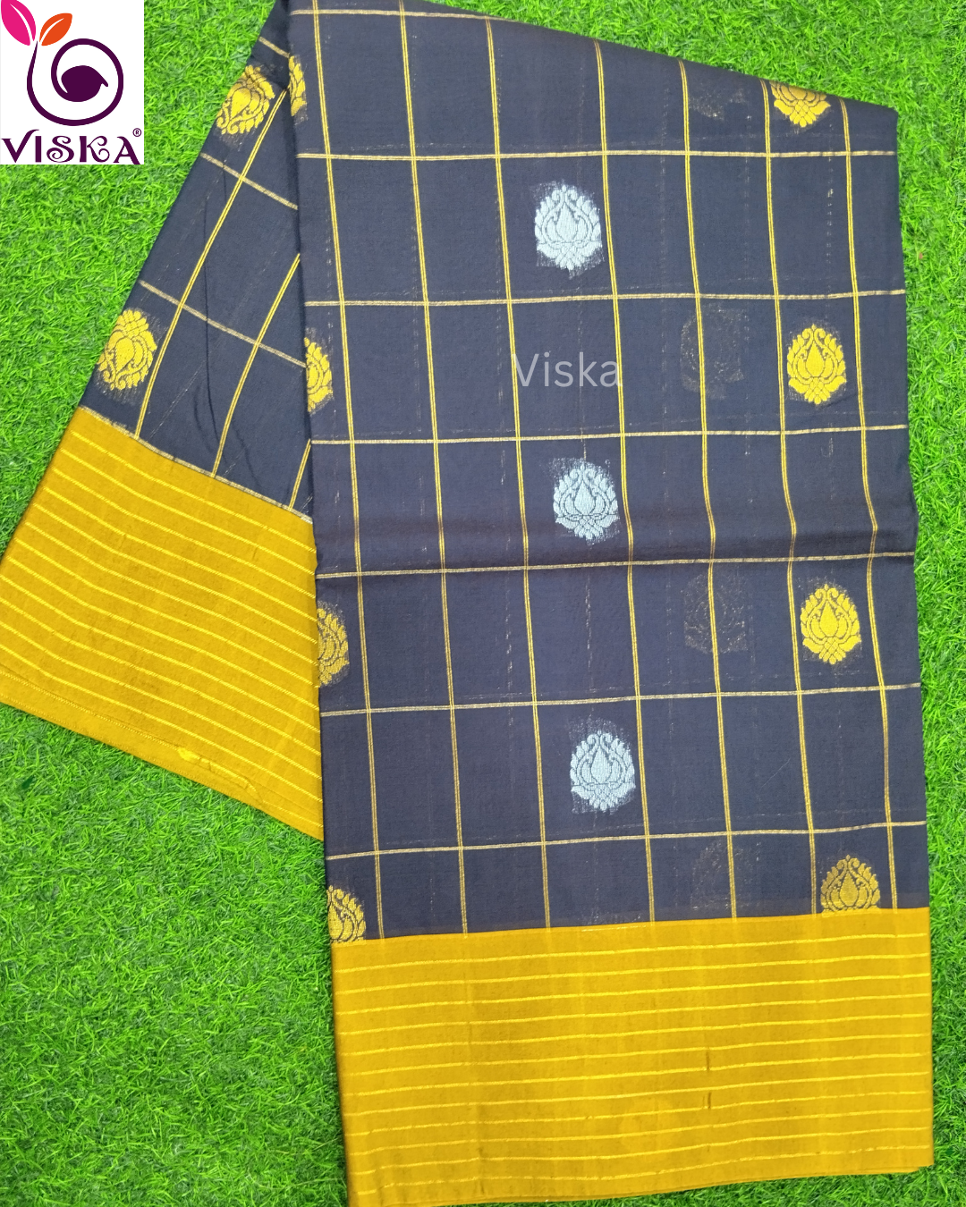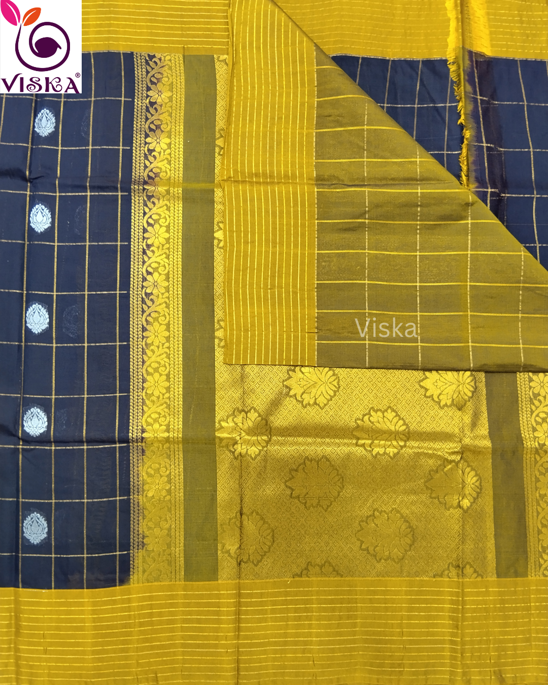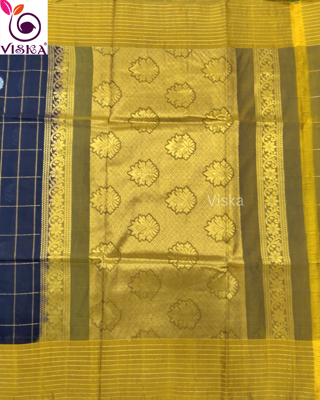 Expertly crafted with a blend of Gadwal cotton and silk, this Black and Gold checks saree boasts a rich pallu and a zari woven border. A contrasting blouse completes the elegant look.