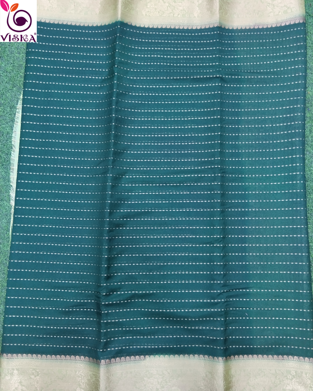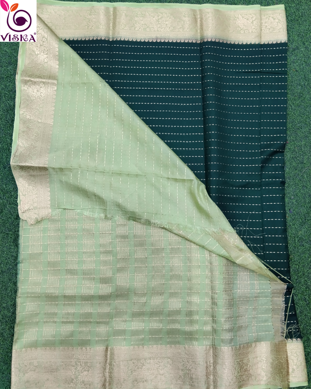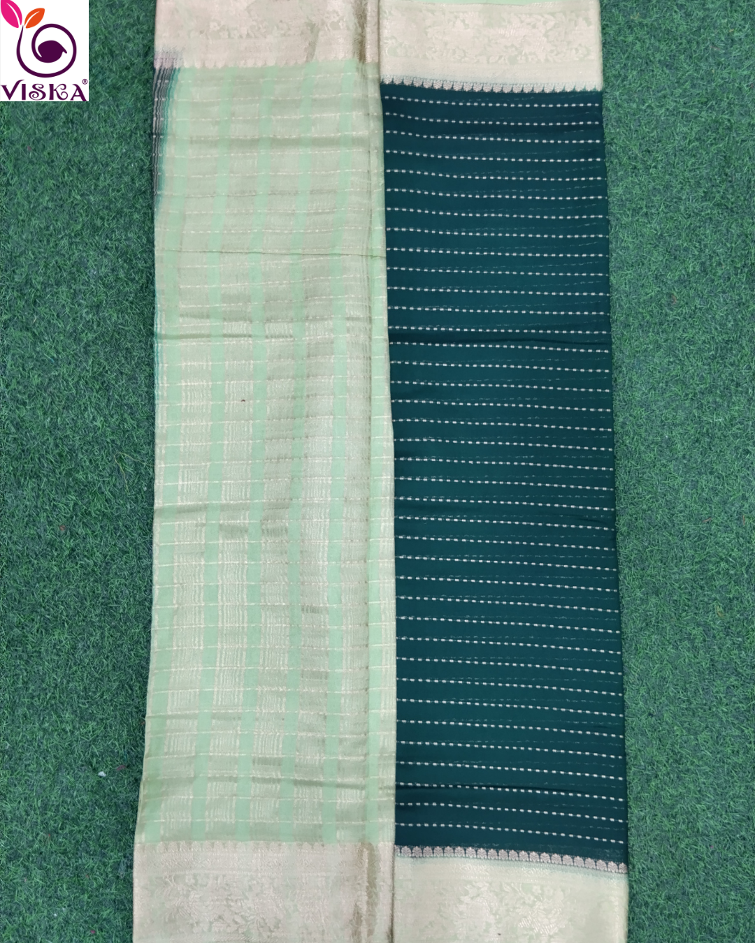 This saree is made of Mysore crepe georgette silk in a rich bottle green color.