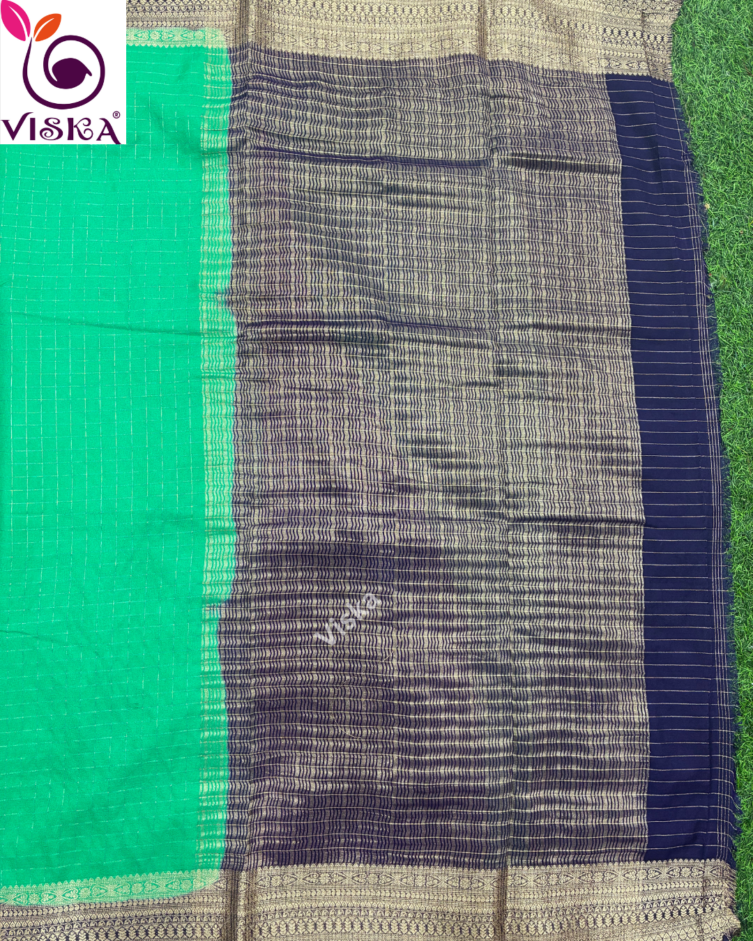 Mysore Crepe Georgette Silk Saree Green and Blue with checks Pattern
