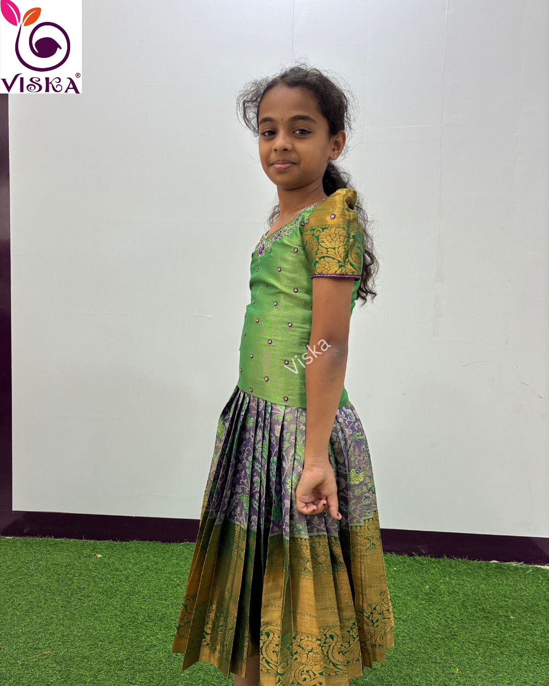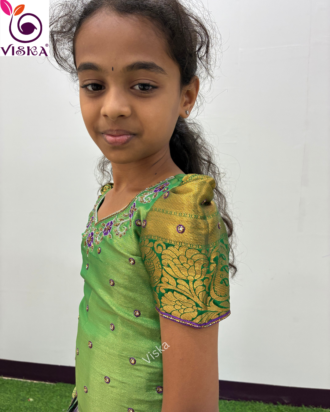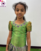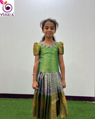 Transform your child's style with Viska's designer Silk Lehenga and Blouse in Green and Violet. This Lehenga is perfect for your little one for any special occasion.