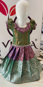 Discover Viska's Ruffled Violet-Green Lehenga, featuring a lush green broad zari border and a delightful ruffled-style blouse. Perfect for festive occasions, this ensemble combines charm with comfort. Don't miss out – shop now for incredible offers and dress your little one in festive flair!