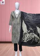 Feel Linen Readymade salwar suit off-white & black with stripes and V neck and straight cut pant & dupatta