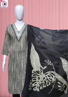 The Feel Linen Readymade salwar suit in off-white and black is the perfect combination of style and comfort. Its V neck and straight cut pant provide a flattering silhouette, while the stripes add a touch of elegance. Made with high-quality linen, it's both soft and durable. Complete the look with the included dupatta.