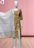 Muslin Silk readymade salwar suit brown & white with embroidery work and elephant plazzo & Silk dupatta
