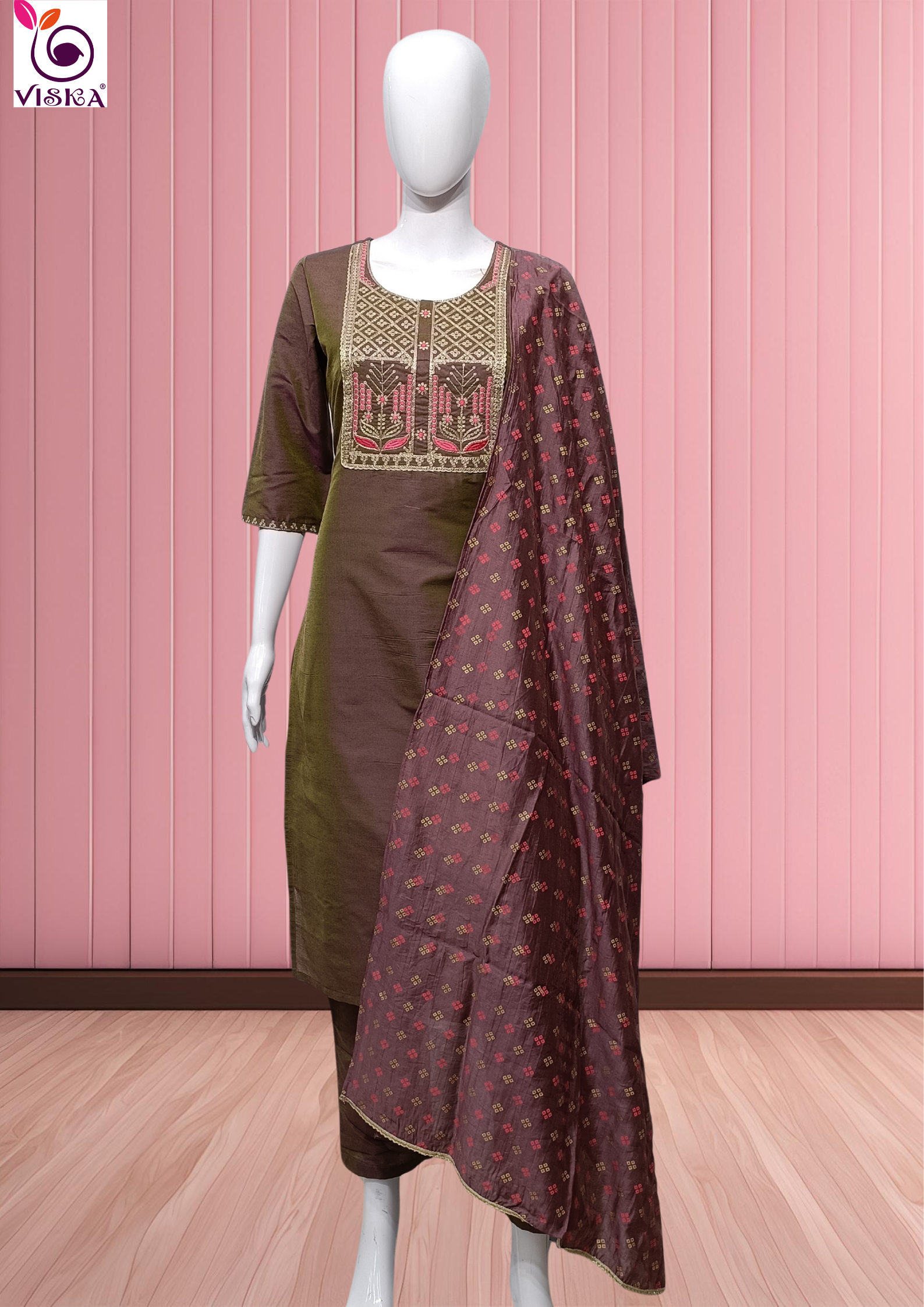Silk readymade salwar suit with embroidery work and straight cut pant & Silk dupatta