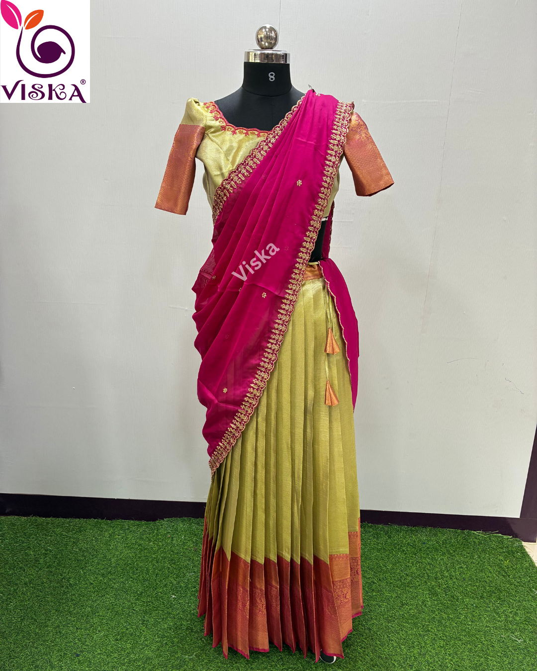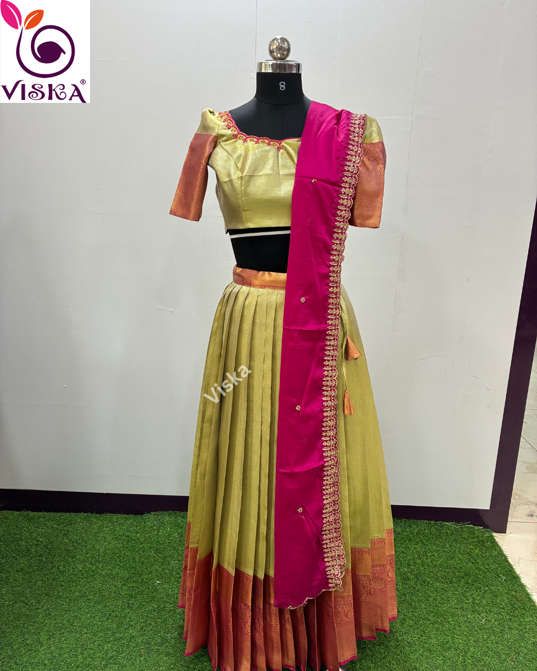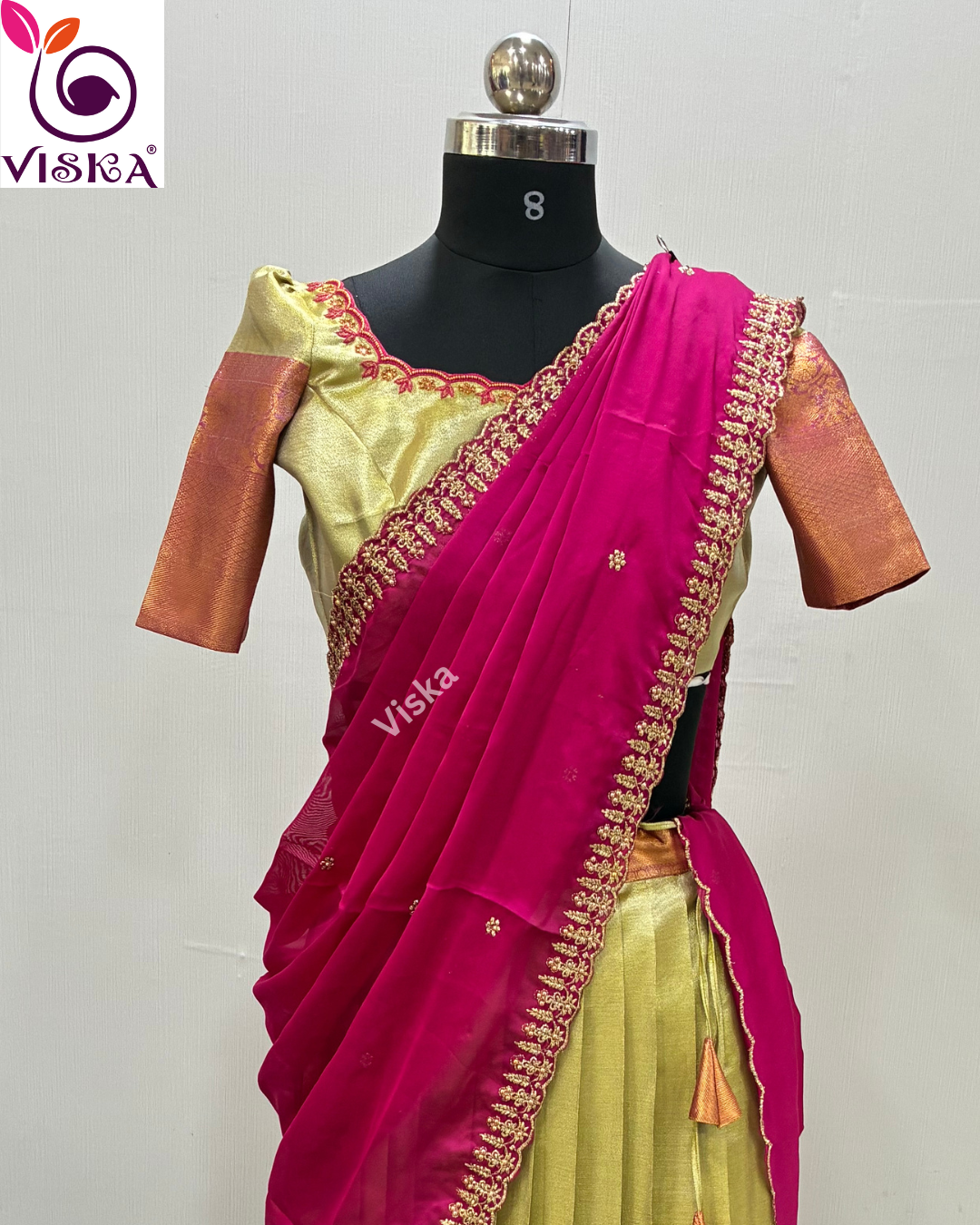 Elevate your ethnic wardrobe with the Viska brand Silk Lehenga. Featuring intricate aari work and a stunning pink color combination, it comes with a gorgeous georgette dupatta. Perfect for any occasion, this lehenga will surely make you stand out.