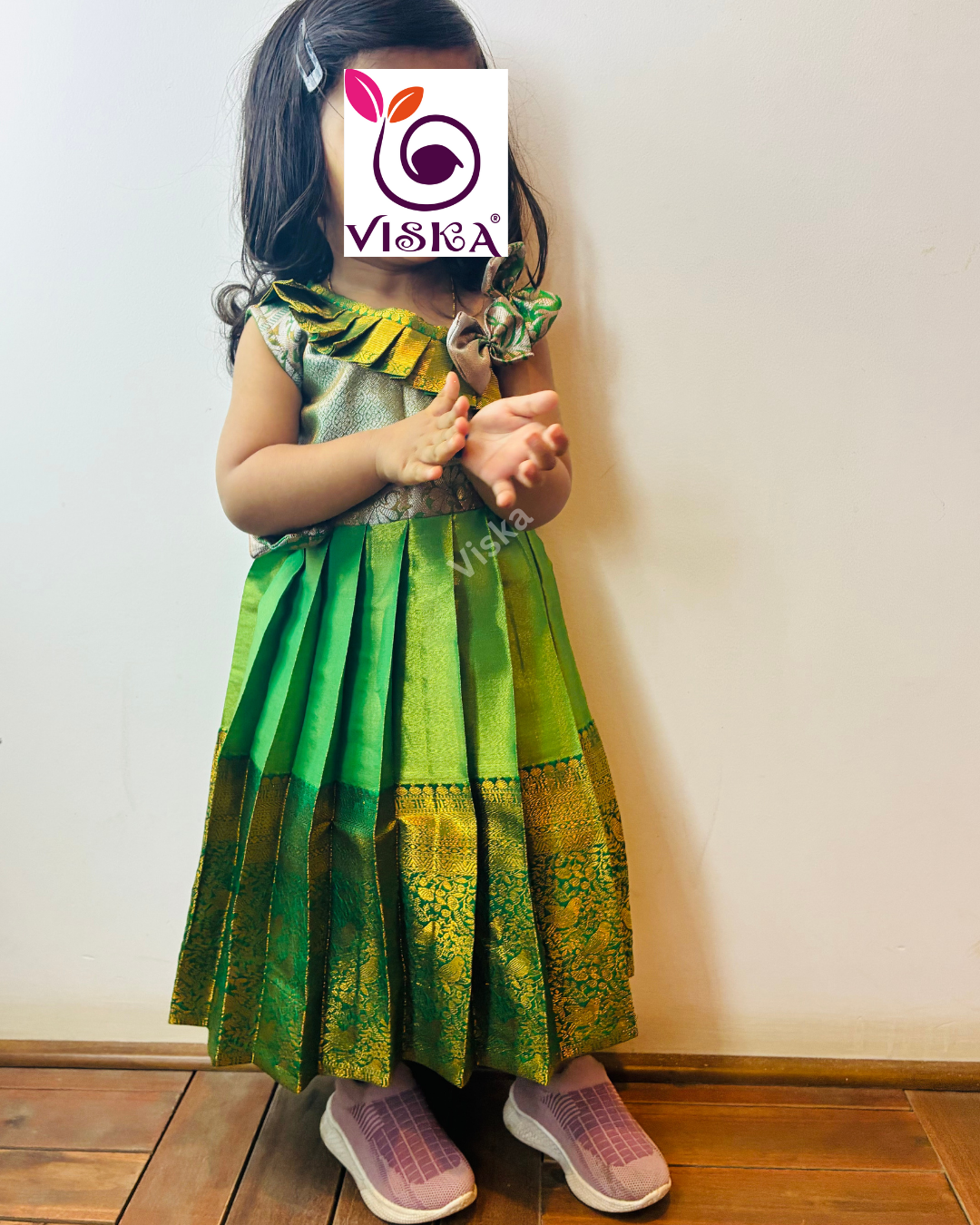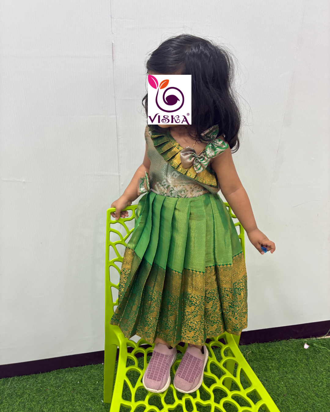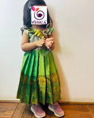 This charming Silk green frock features beautiful neck design, adding a playful and fashionable touch to your child's outfit. Perfect for bringing a splash of fun to their wardrobe!