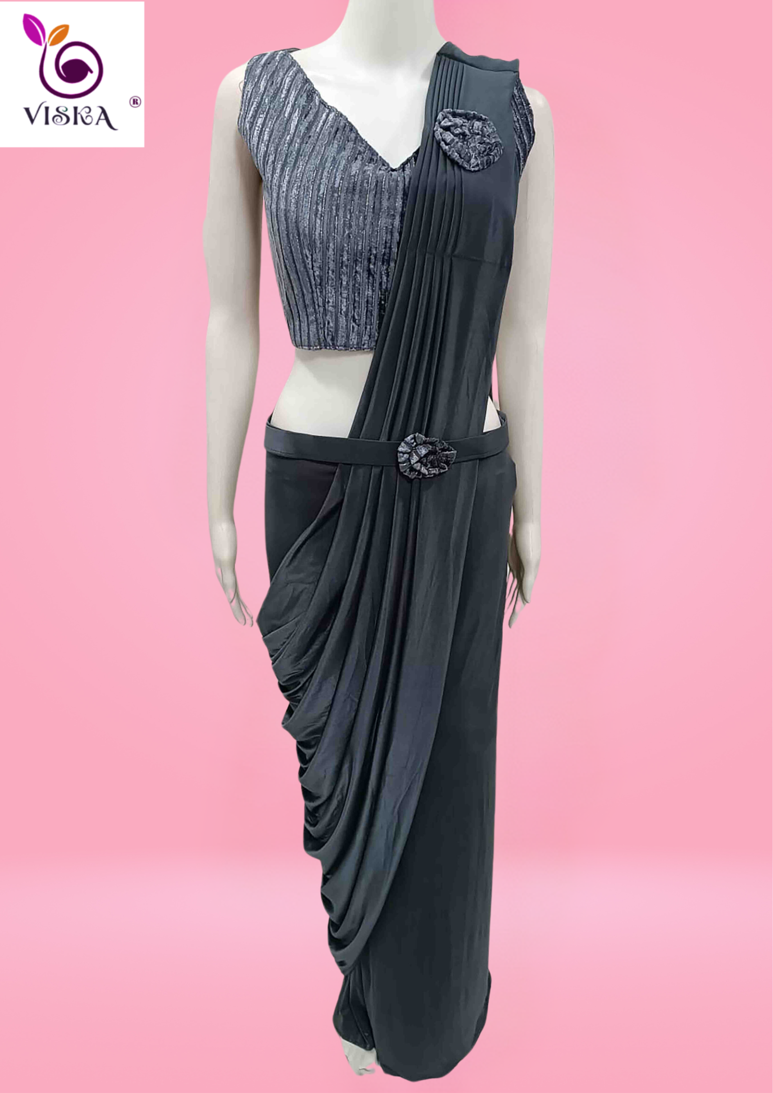 Introducing Viska's expertly designed ready-to-wear saree which comes with a beautifully stitched blouse in a stunning silver color. Our pre-stitched design eliminates the need for draping, so you can step out in style with ease. The blouse is available in a free size, ensuring a perfect fit for everyone. Whether it's a wedding or a festive occasion, this fancy work saree is sure to turn heads. Get yours today!