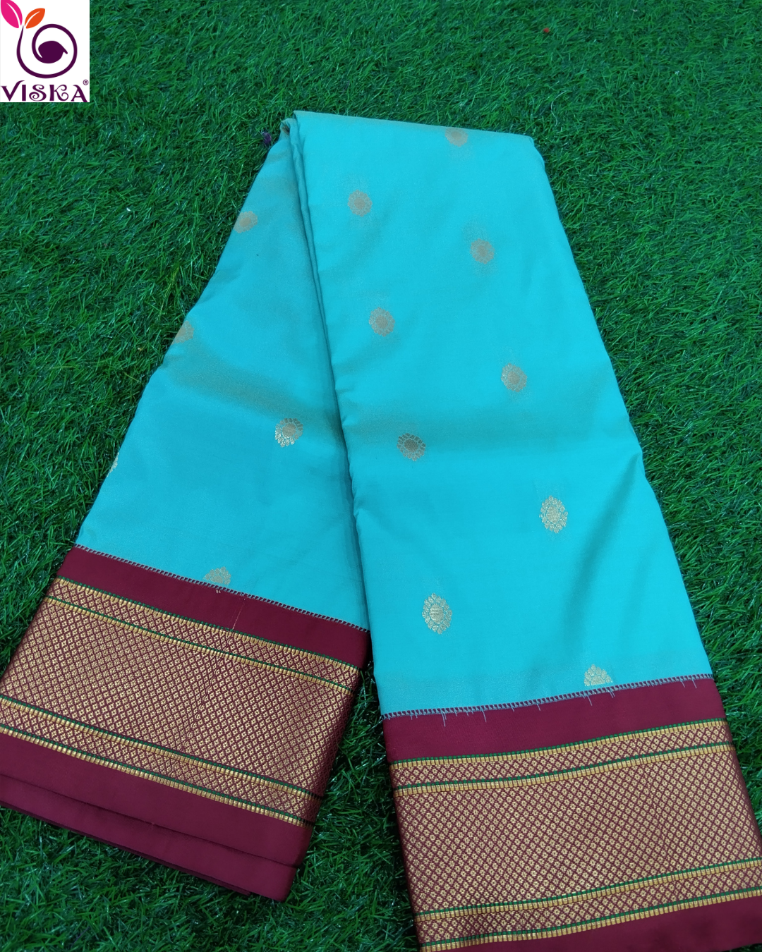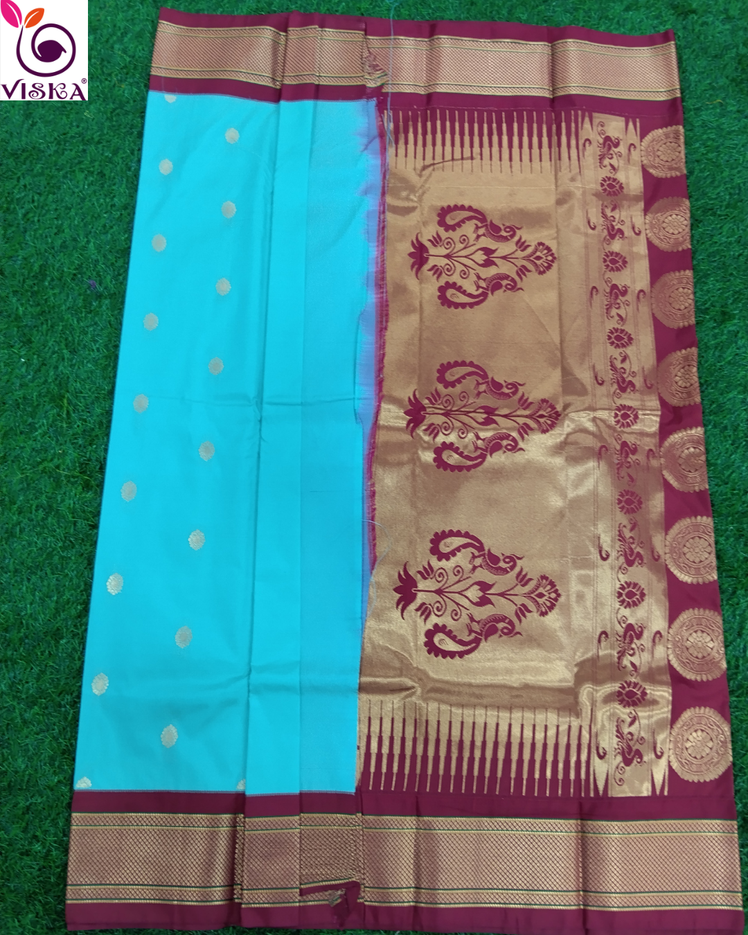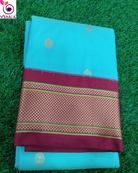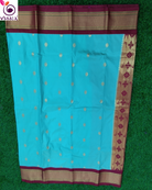 Expertly crafted with a vibrant sky blue silk fabric, this saree boasts a rich Pallu and a contrasting brown kuttu border.