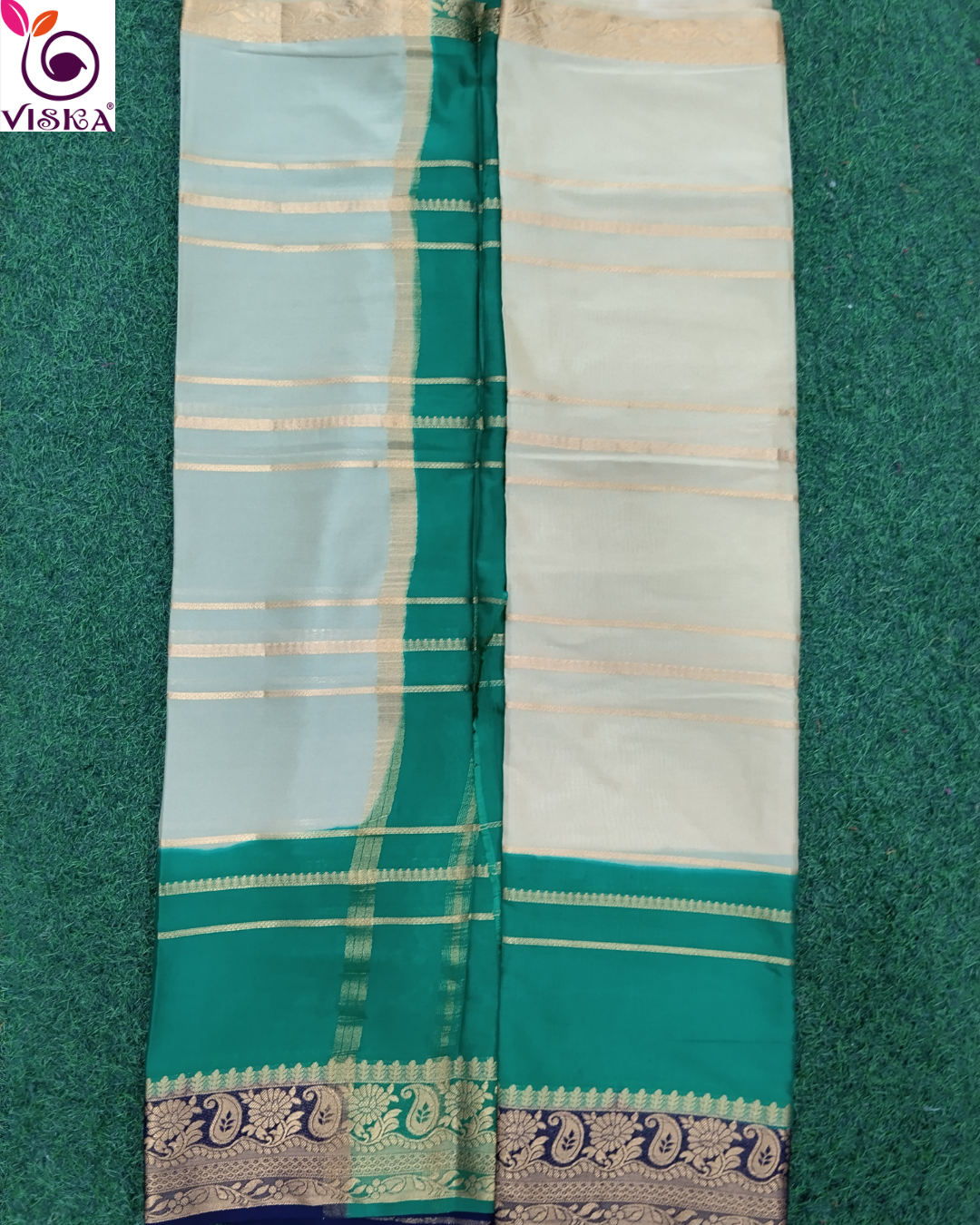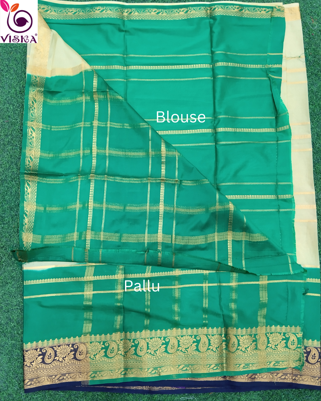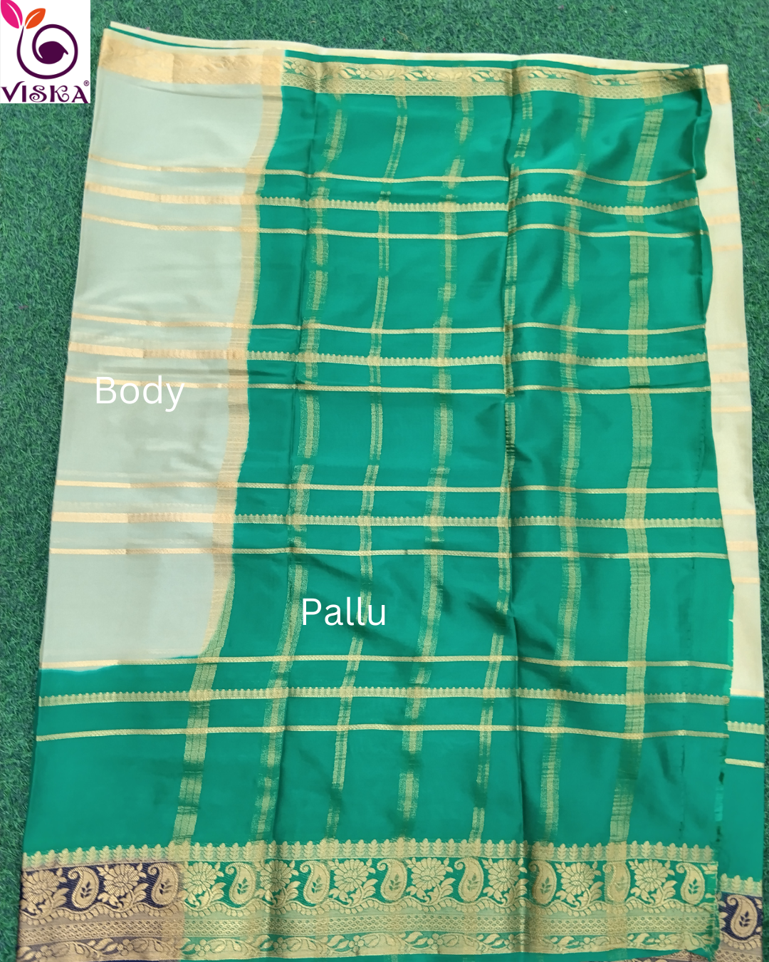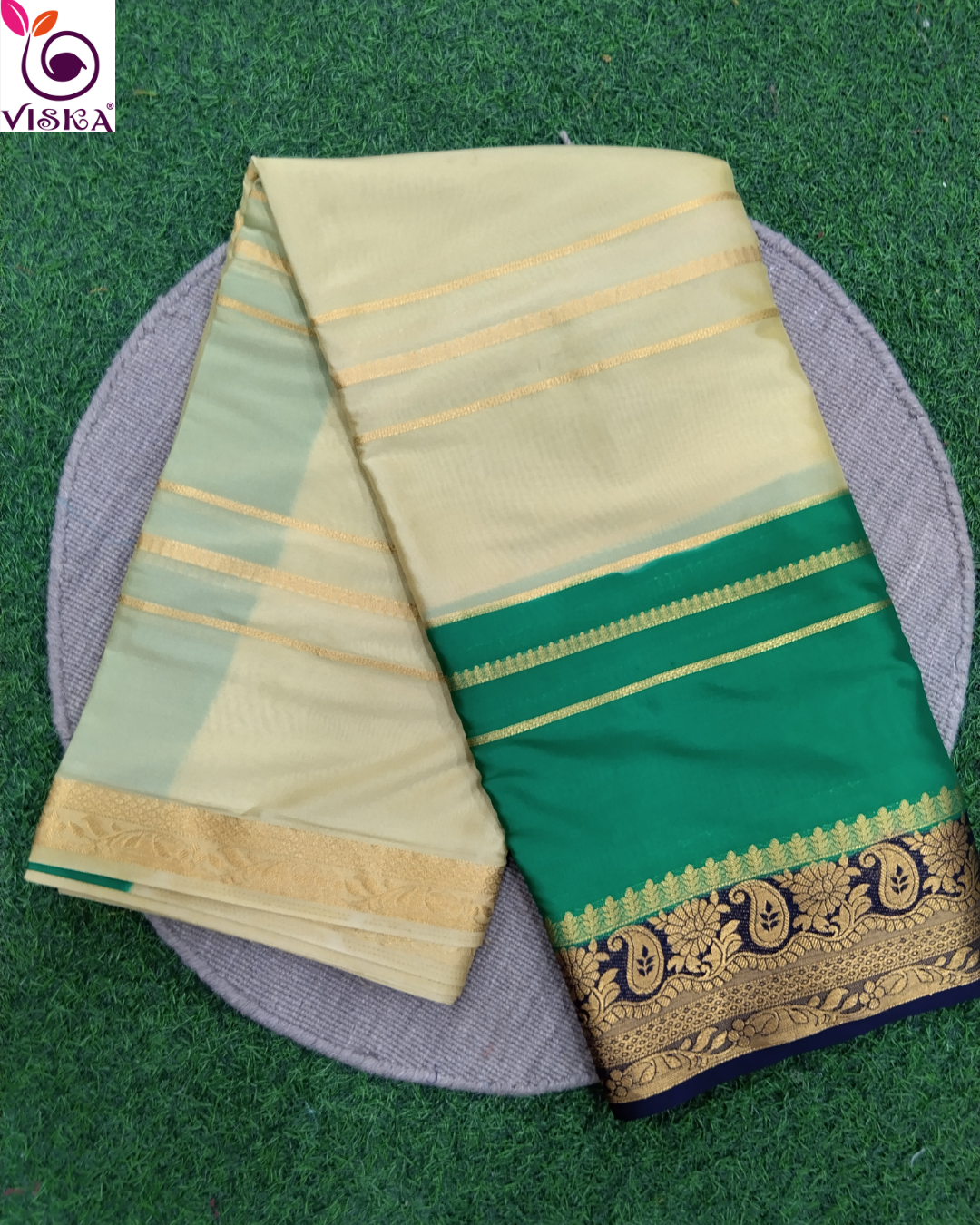 This saree is made of Mysore crepe silk and features a combination of Cream and Green colors.