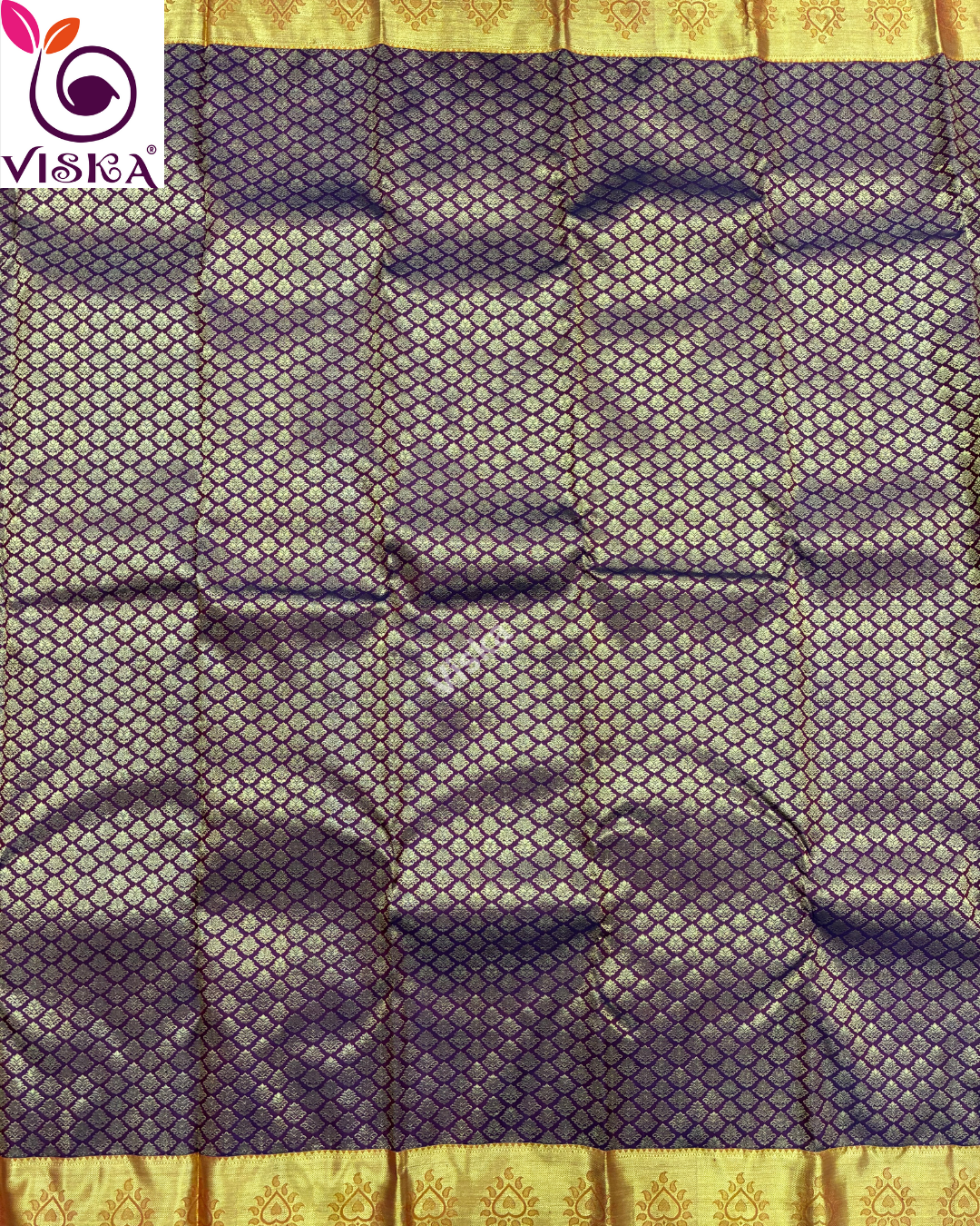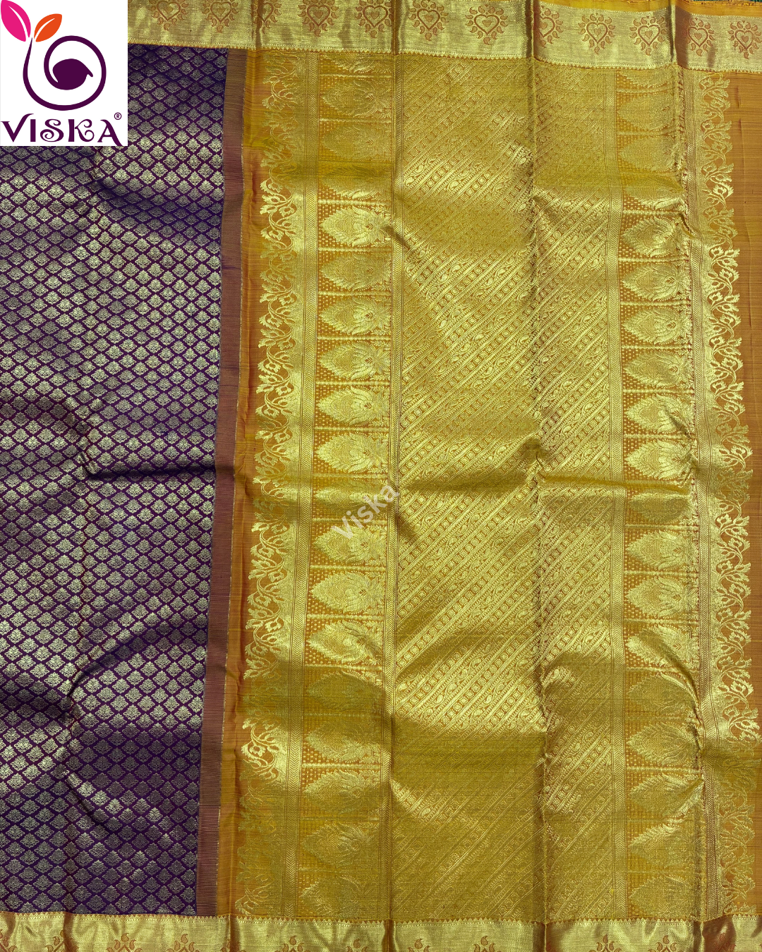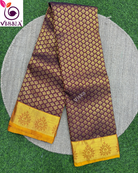 Expertly crafted with 100% pure Kanchipuram silk, this stunning maroon saree features intricate buttas all-over and a striking mustard yellow zari border. Elevate your wardrobe with the timeless elegance and luxurious feel of this traditional saree.