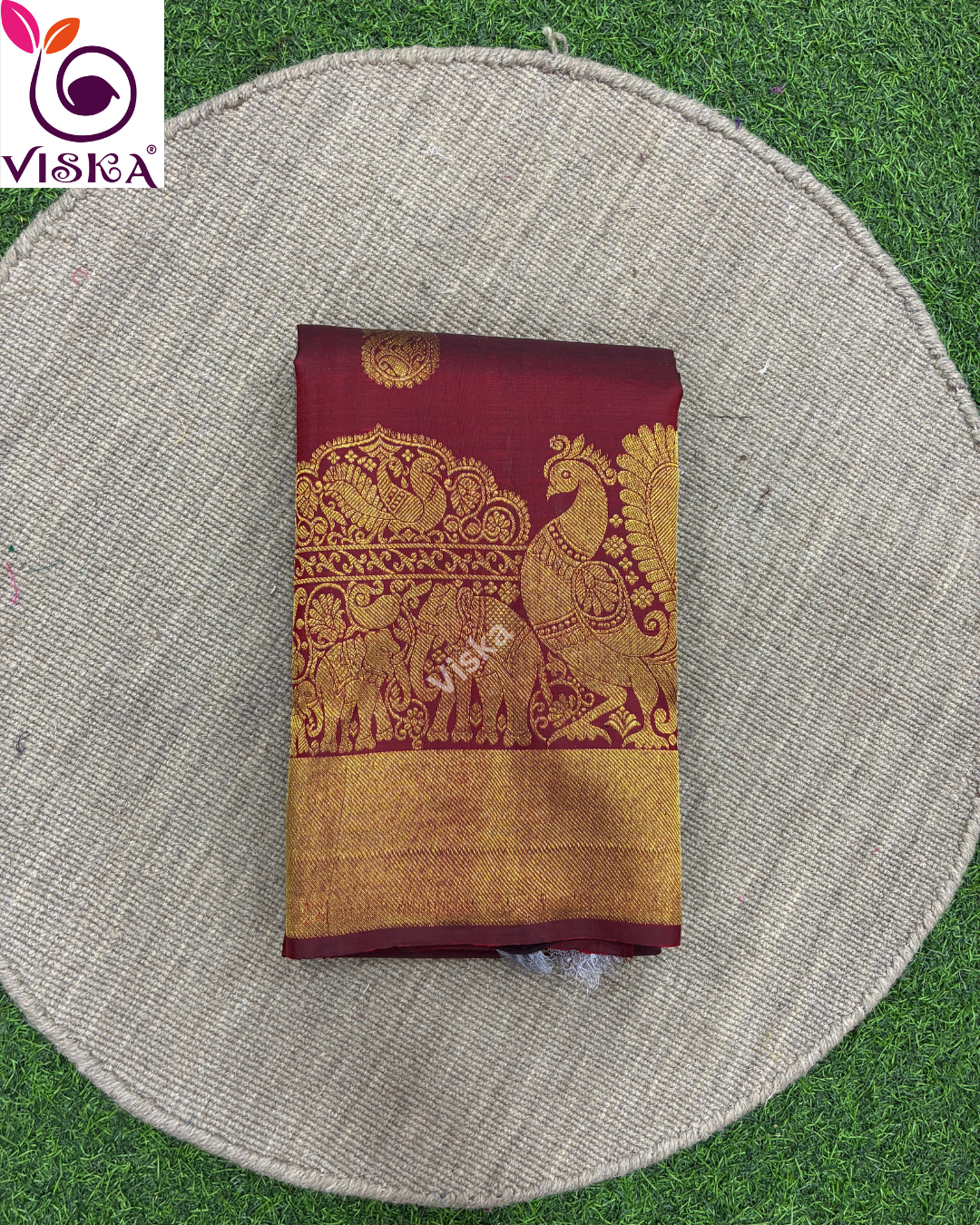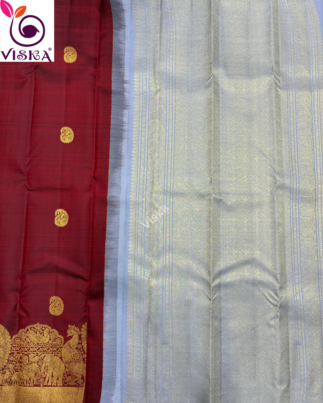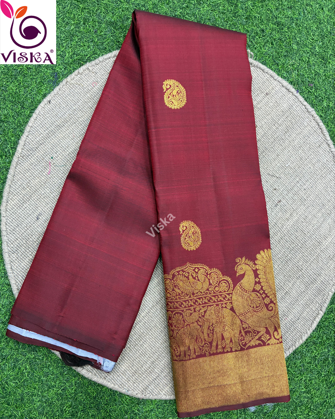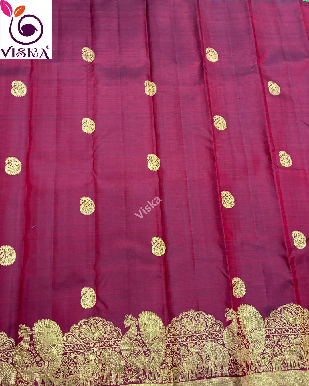 Pure Kanchipuram Silk Saree Maroon with all-over buttas and one side turning border
