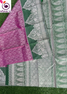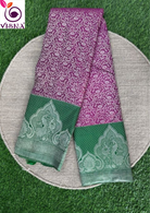 This exquisite Pure Kanjivaram Silk Saree boasts a vibrant combination of purple and green, adorned with all-over floral weaves and a stunning Green & zari border. Crafted from pure silk, it features a rich pallu and comes with a bottle green plain blouse. The intricate floral zari weaves add a touch of elegance to this traditional saree.