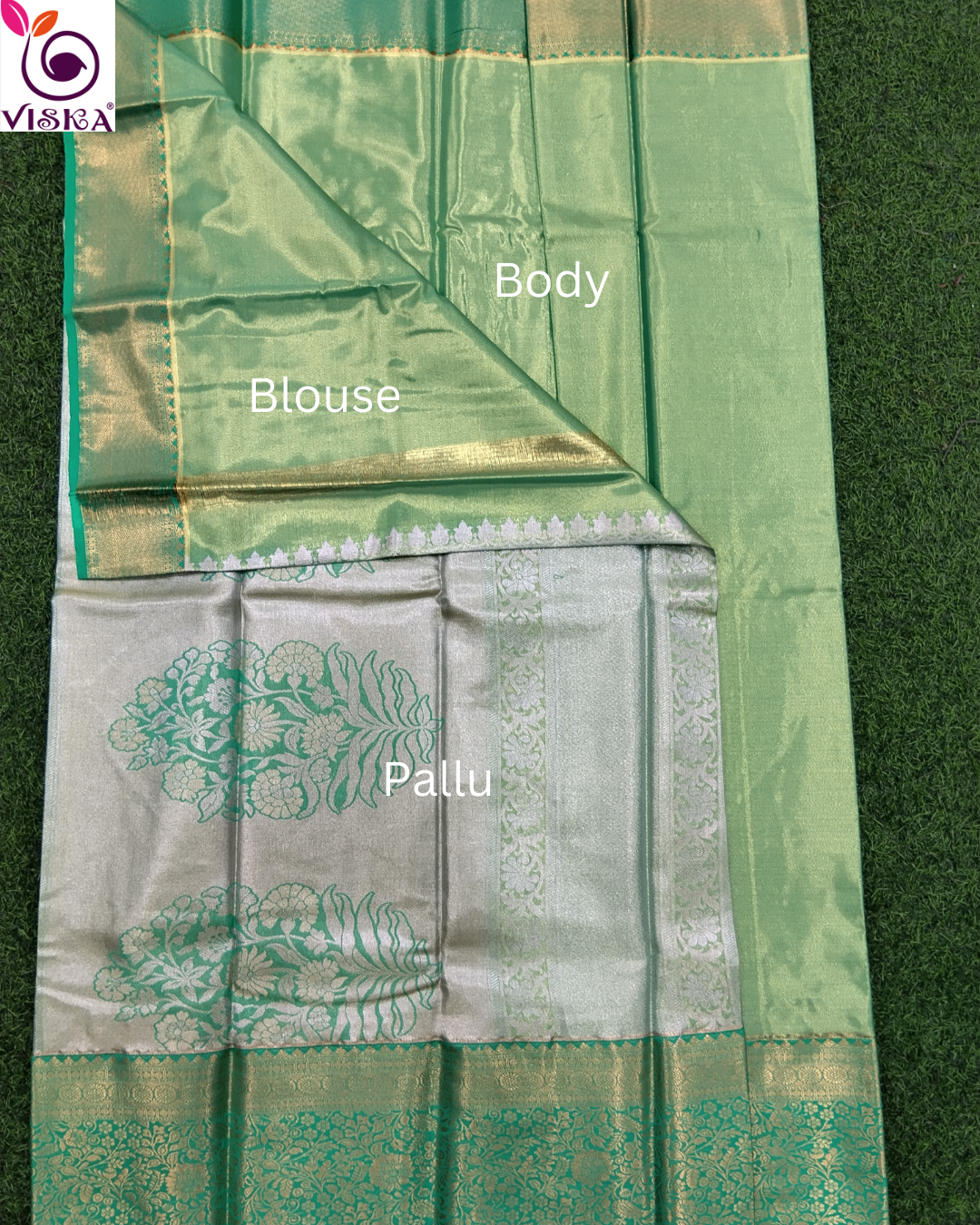 Viska's customized Kanjivaram plain silk saree in Green boasts a rich contrast pallu and zari woven purple border. Plain saree and high-quality silk make it a perfect choice for any occasion. Elevate your wardrobe with this timeless Saree.