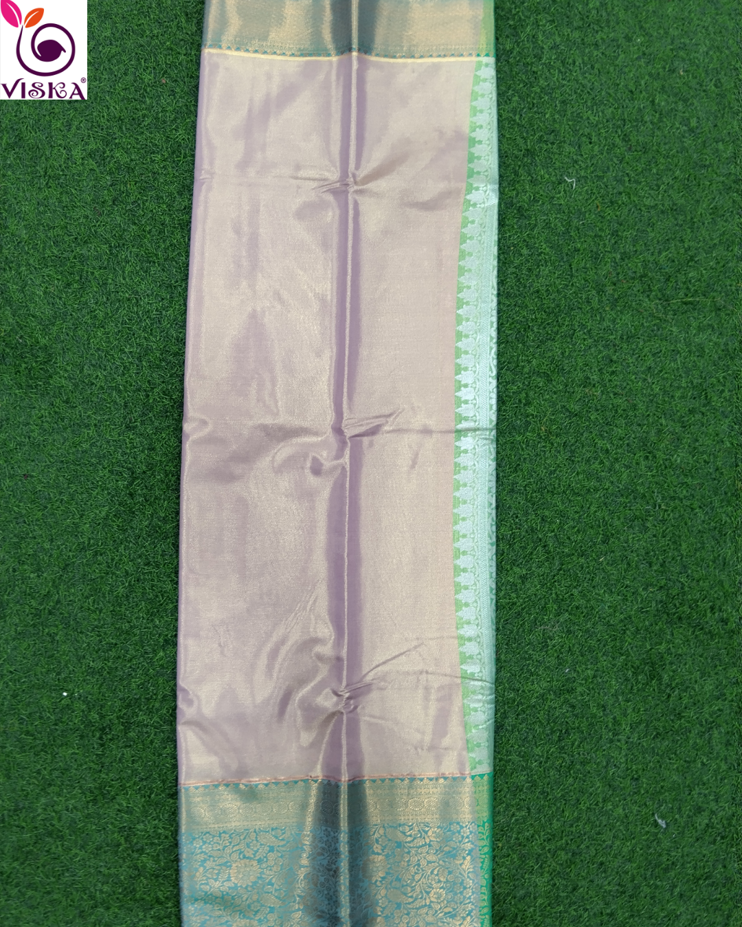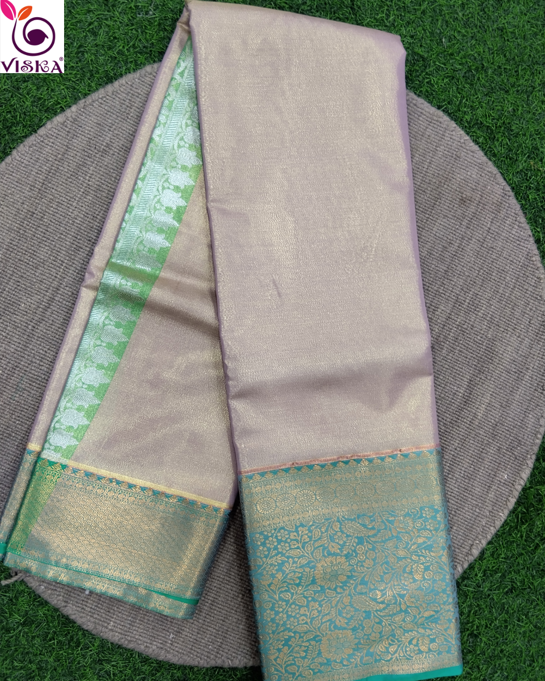Viska's customized Kanjivaram plain silk saree in Light Gold and Green boasts a rich pallu and zari woven border. Plain saree and high-quality silk make it a perfect choice for any occasion. Elevate your wardrobe with this timeless Saree.