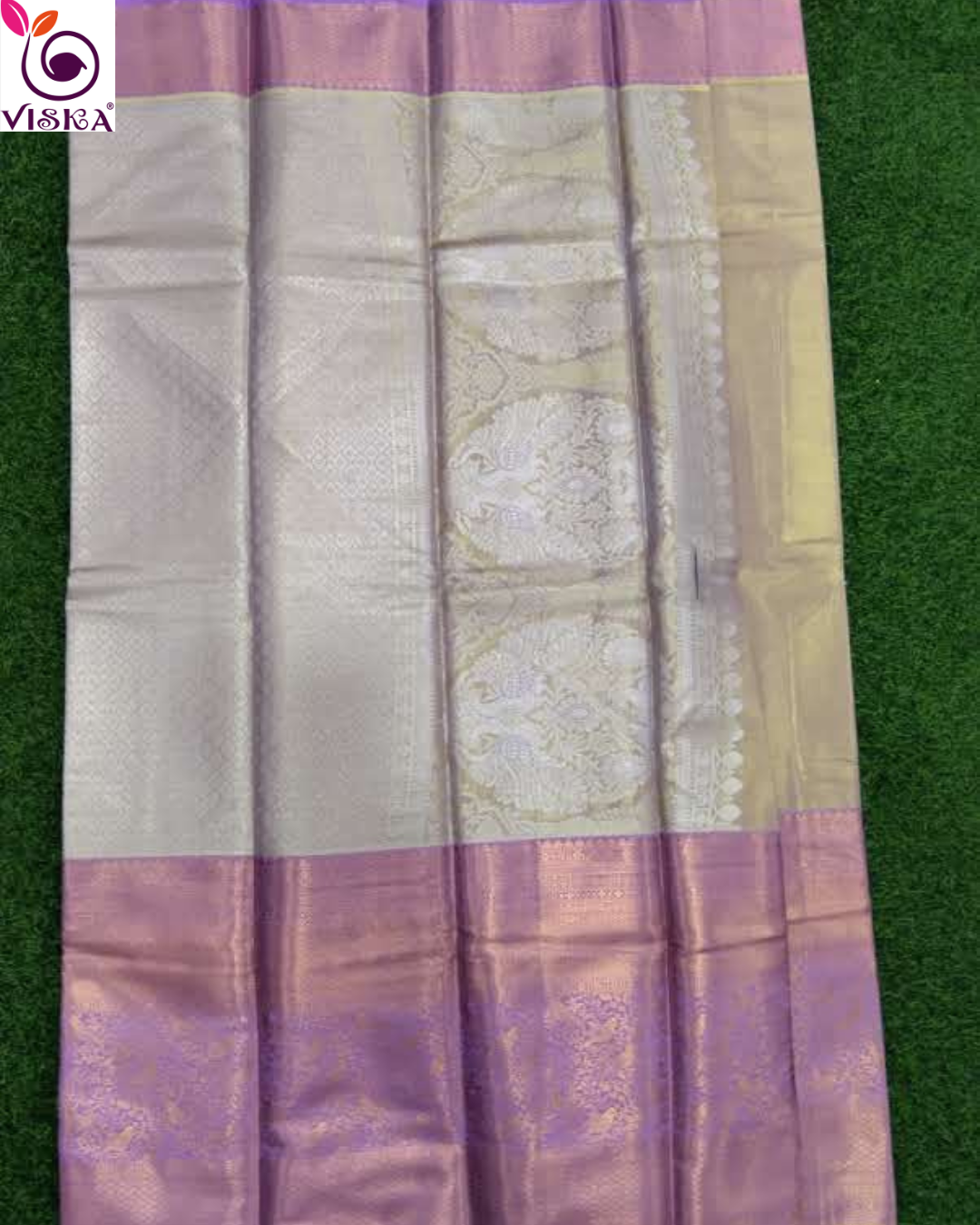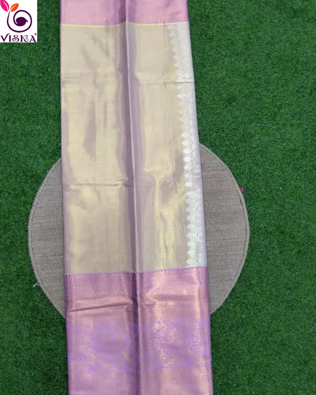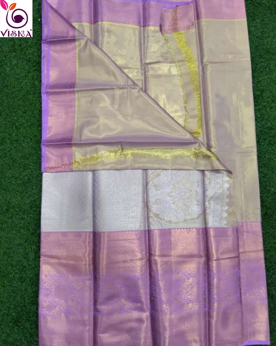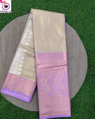 Viska's customized Kanjivaram plain silk saree in Light Gold and Lavender boasts a rich pallu and long zari woven border. Plain saree and high-quality silk make it a perfect choice for any occasion. Elevate your wardrobe with this timeless Saree.
