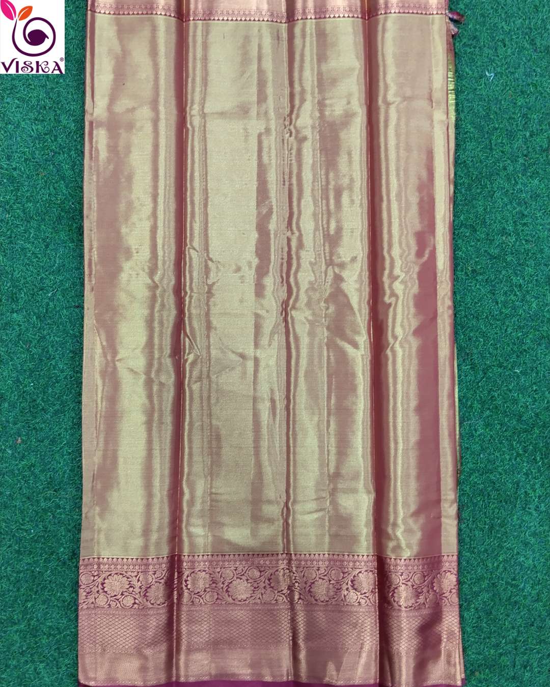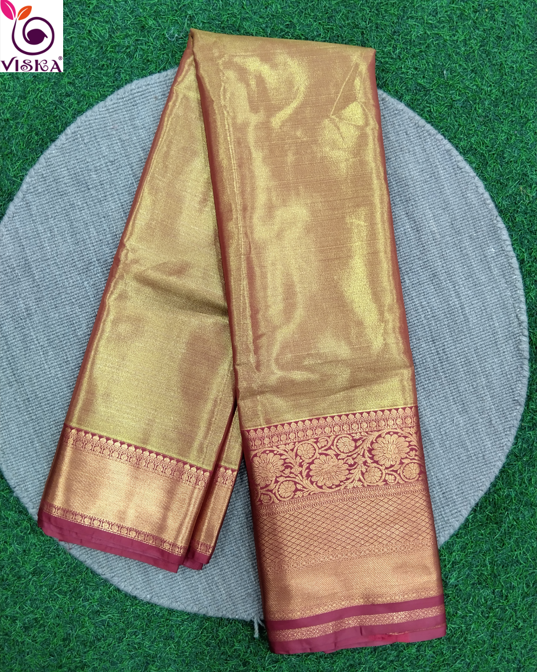 Viska's customized Kanjivaram complete plain silk saree in maroon gold with zari woven border. Plain saree and high-quality silk make it a perfect choice for any occasion. Elevate your wardrobe with this timeless Saree.