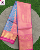 Viska's customized Kanjivaram plain silk saree in Pink and Blue boasts a rich pallu and zari woven border. Plain saree and high-quality silk make it a perfect choice for any occasion. Elevate your wardrobe with this timeless Saree.