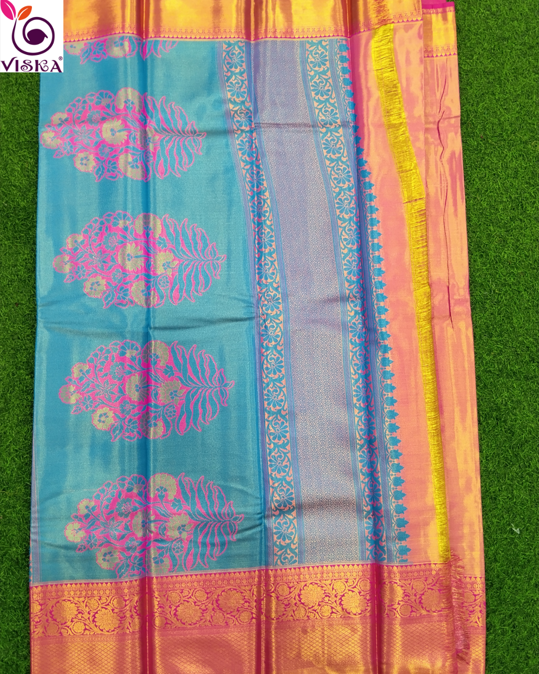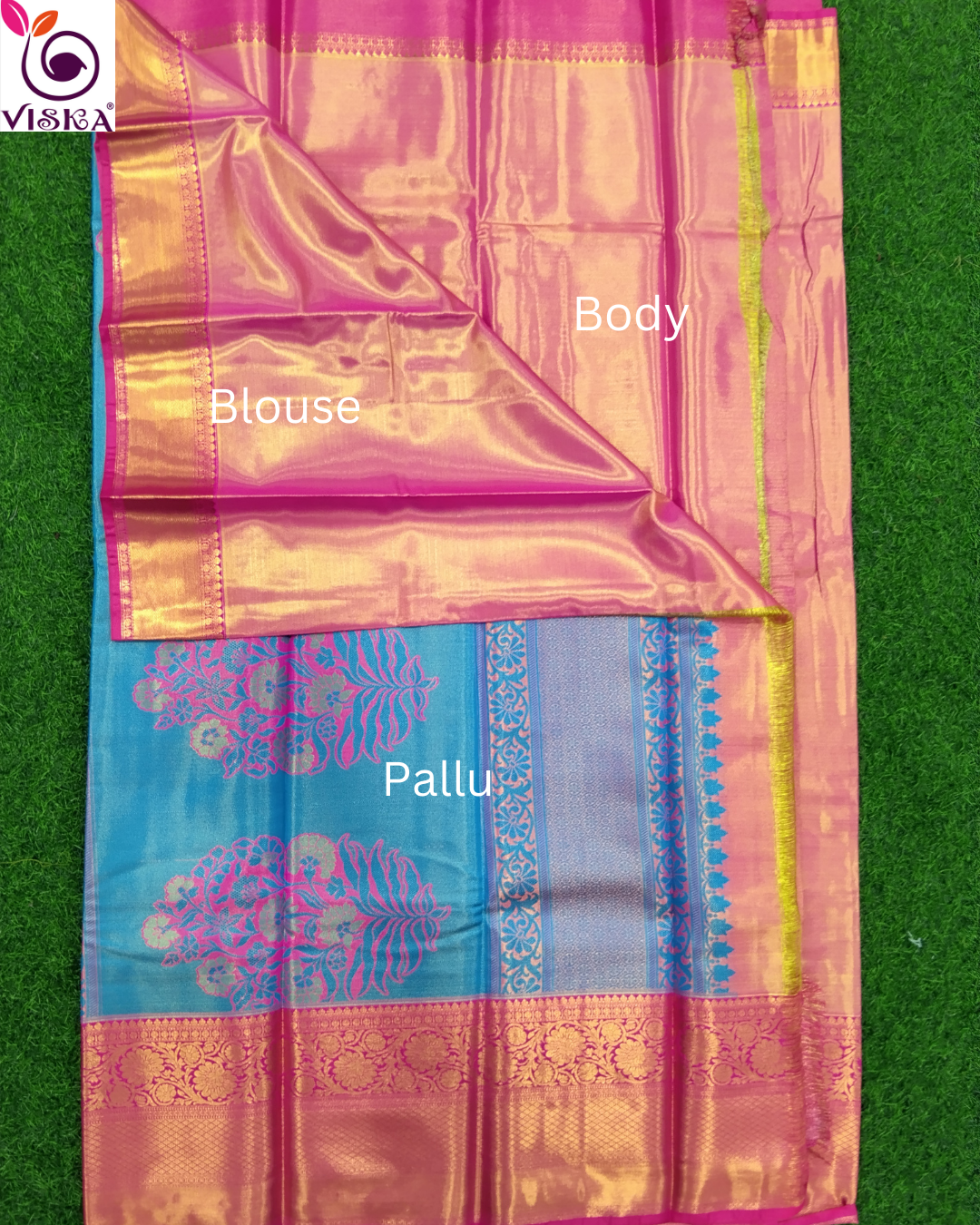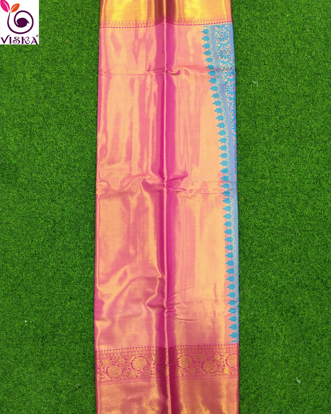 Kanjivaram Plain Silk Saree Pink and Blue with rich Pallu and zari woven border