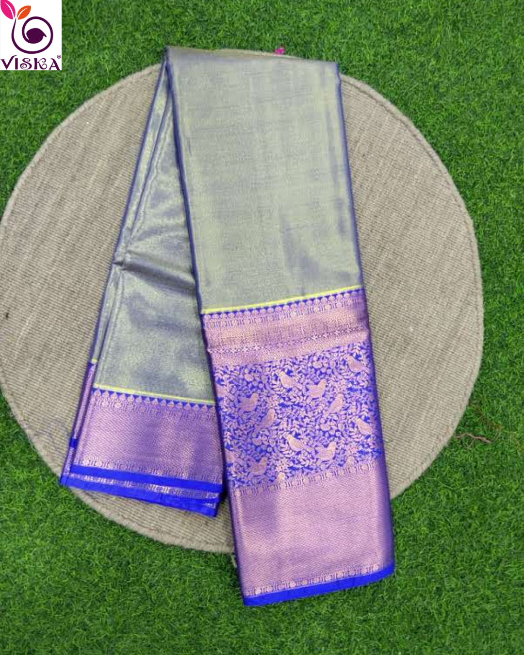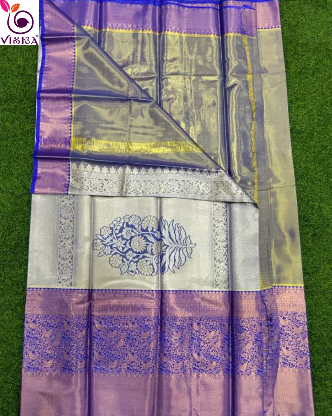 Viska's customized Kanjivaram plain silk saree in Violet boasts a rich pallu and long zari woven border. Plain saree and high-quality silk make it a perfect choice for any occasion. Elevate your wardrobe with this timeless Saree.