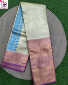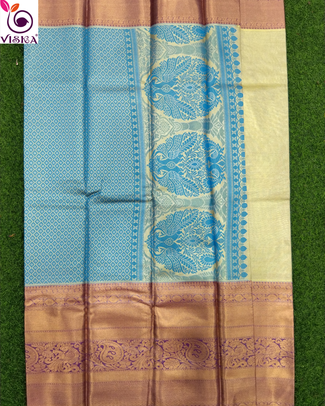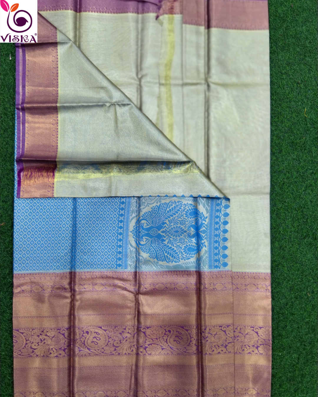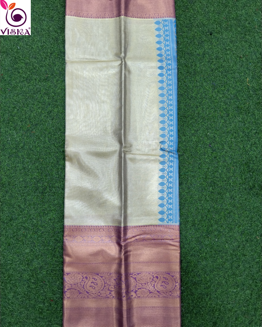 Viska is excited to introduce its latest custom creation, the Plain Zari tissue Saree. This saree sets a new standard in style with its beautiful light purple border and blue color pallu with a running blouse.
