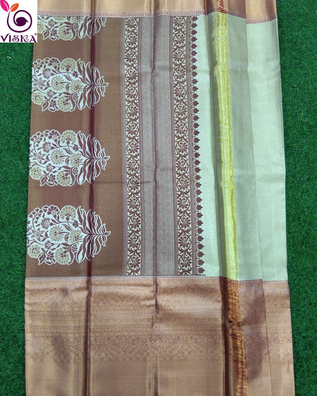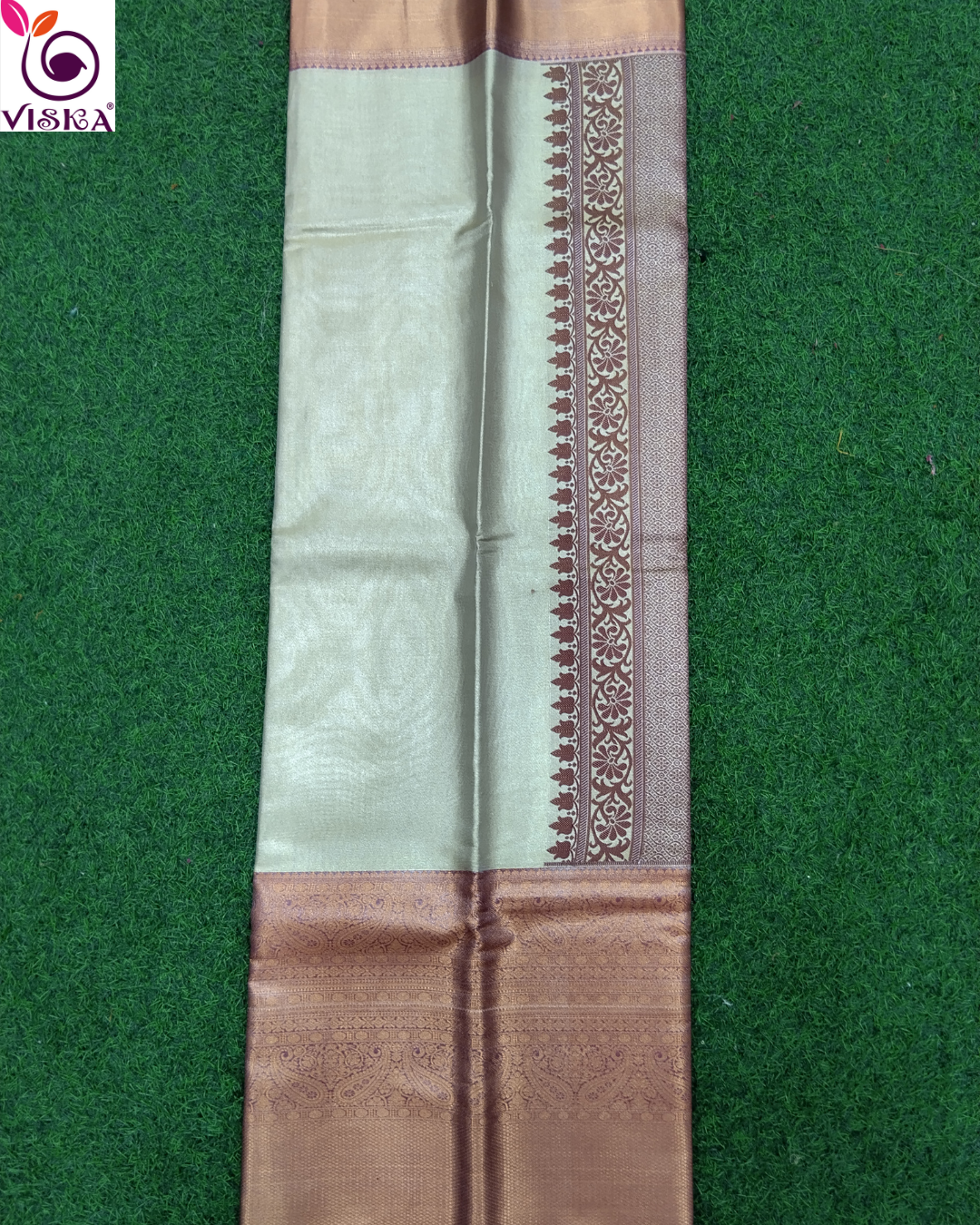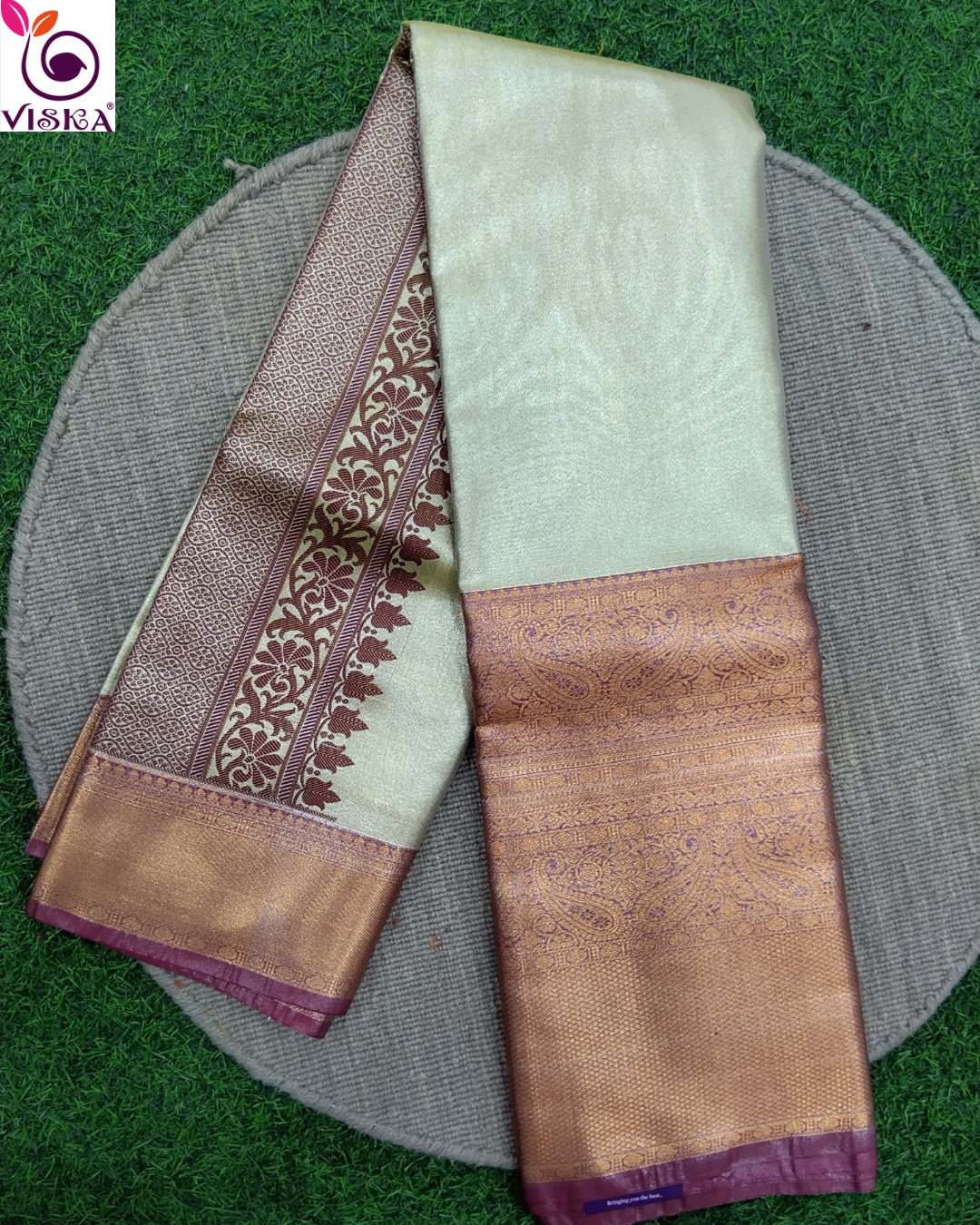 Viska is excited to introduce its latest custom creation, the Plain Zari tissue Saree. This saree sets a new standard in style with its beautiful brown border and rich pallu with a running blouse.