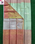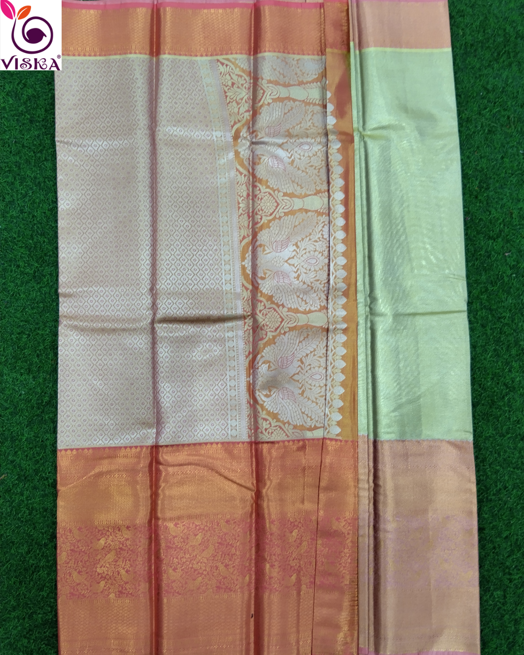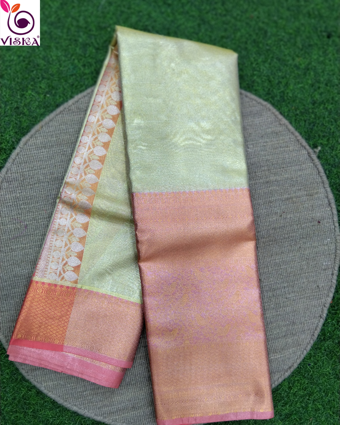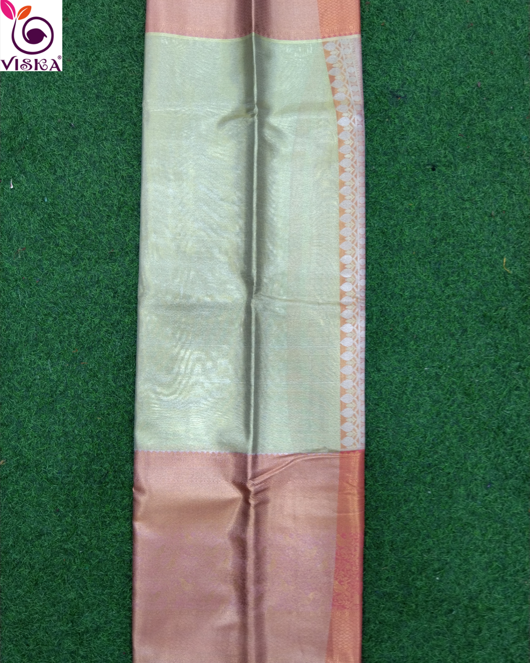 Viska is excited to introduce its latest custom creation, the Plain Zari tissue Saree. This saree sets a new standard in style with its beautiful light orange border and rich pallu with a contrast blouse.