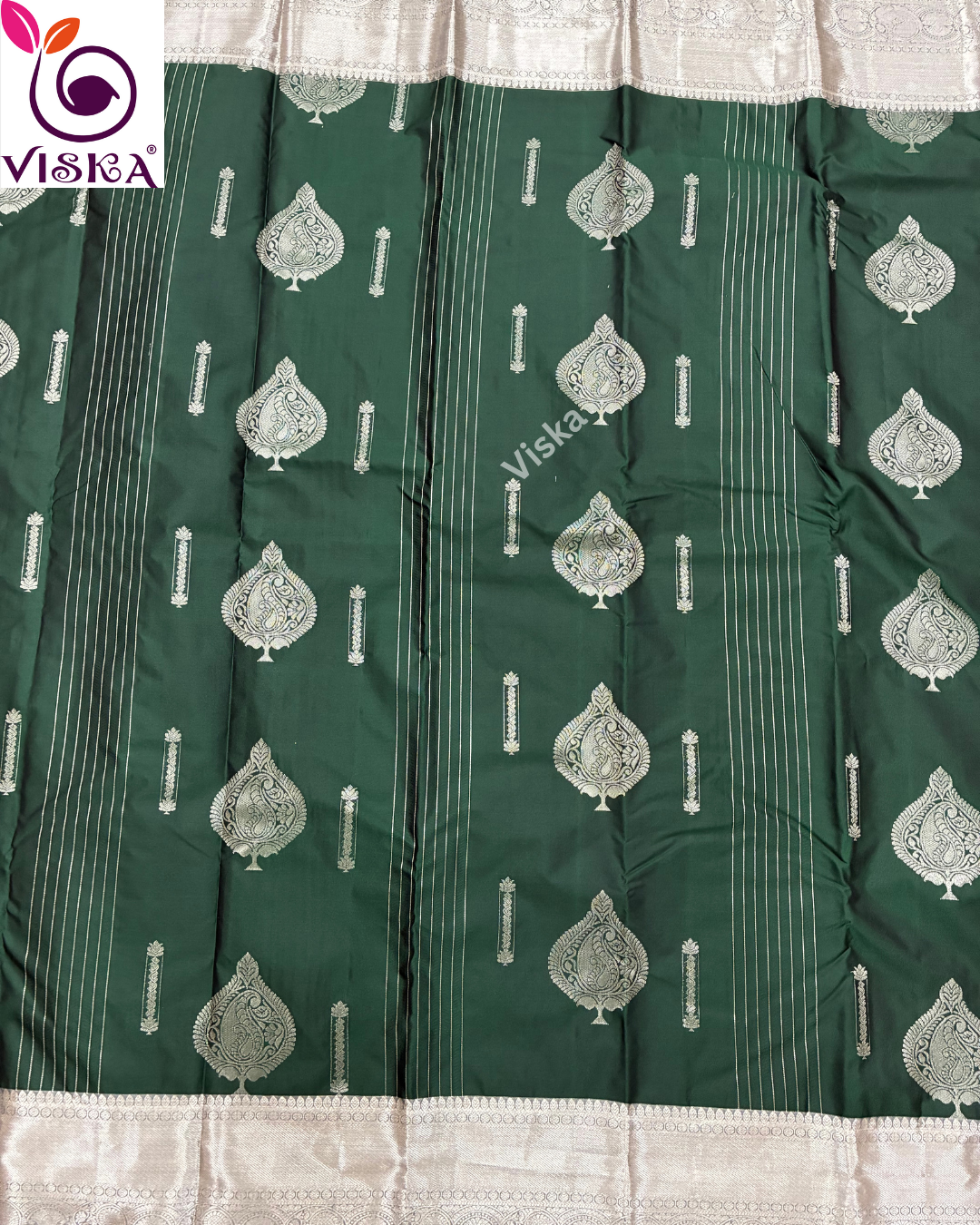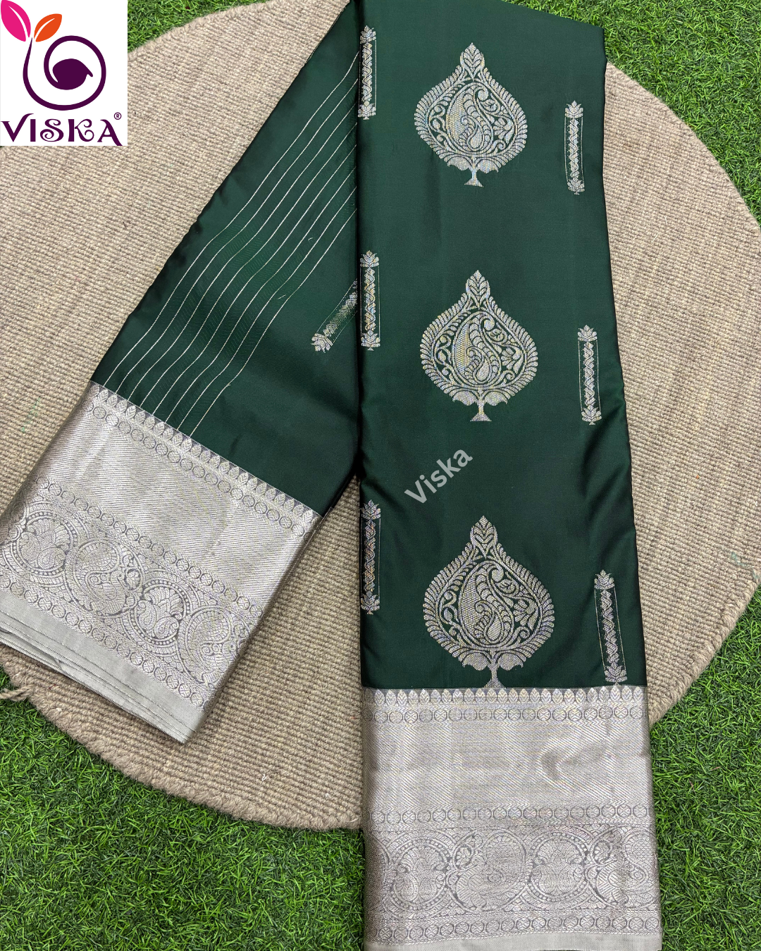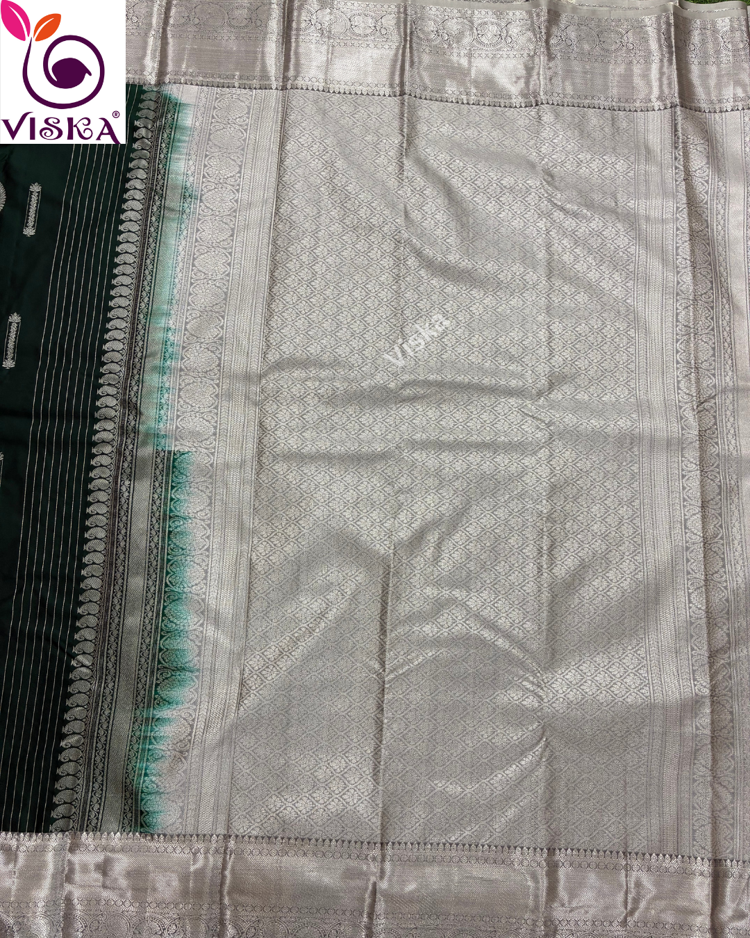 Pure Kanchipuram Soft Silk Saree Bottle Green and Grey with all-over buttas with Zari woven Border