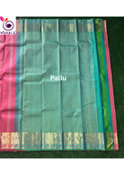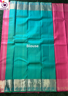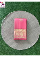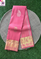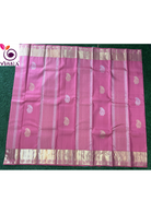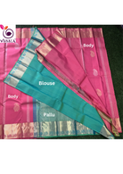 Expertly crafted from pure kanjivaram silk, Viska's Baby Pink and Green saree features intricate all-over buttas and motifs, enhanced by a beautiful zari woven border. The classic geometrical patterns add a touch of elegance to this saree, while the contrasting green pallu and blouse add the perfect pop of color. Elevate your traditional wardrobe with this stunning piece.