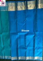 Elevate your traditional wardrobe with our Pure Kanjivaram Silk Saree in Rama Green and Blue. Adorned with elegant buttas and a stunning zari woven border, this saree exudes opulence. The contrast blue pallu with zari adds a touch of sophistication, while the matching blouse completes the look. Experience the luxury of pure silk.