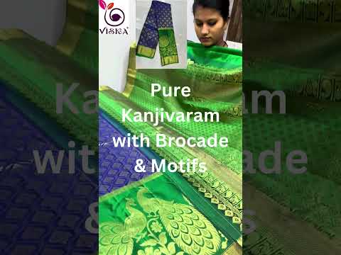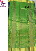 This luxurious Pure Kanjivaram Silk Saree features a combination of violet silk and intricate golden buttas. The bottom is adorned with a stunning green peacock design, adding a touch of traditional charm. The saree is perfectly complemented by a Zari border, making it an ideal choice for special occasions such as weddings or festive gatherings. The elegant peacock motif and vibrant colors make this saree a must-have for those looking for a traditional Kanchipuram style.