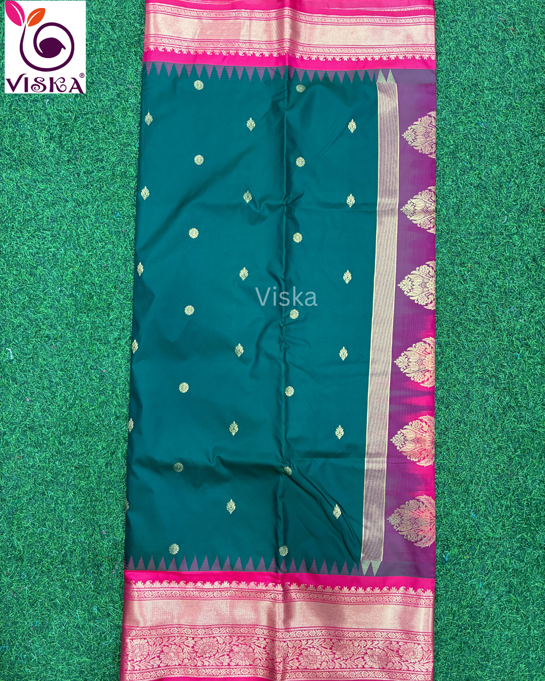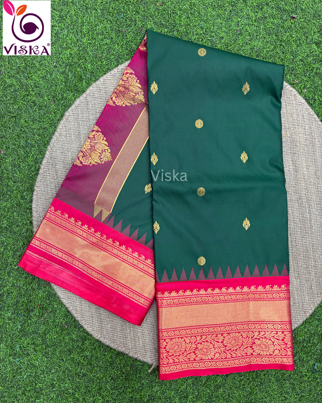 Viska is excited to introduce its latest custom creation, the all-over butta soft silk Saree. This saree sets a new standard in style with its beautiful Bottle Green color with Pinkish red border and rich pallu with a contrast blouse.