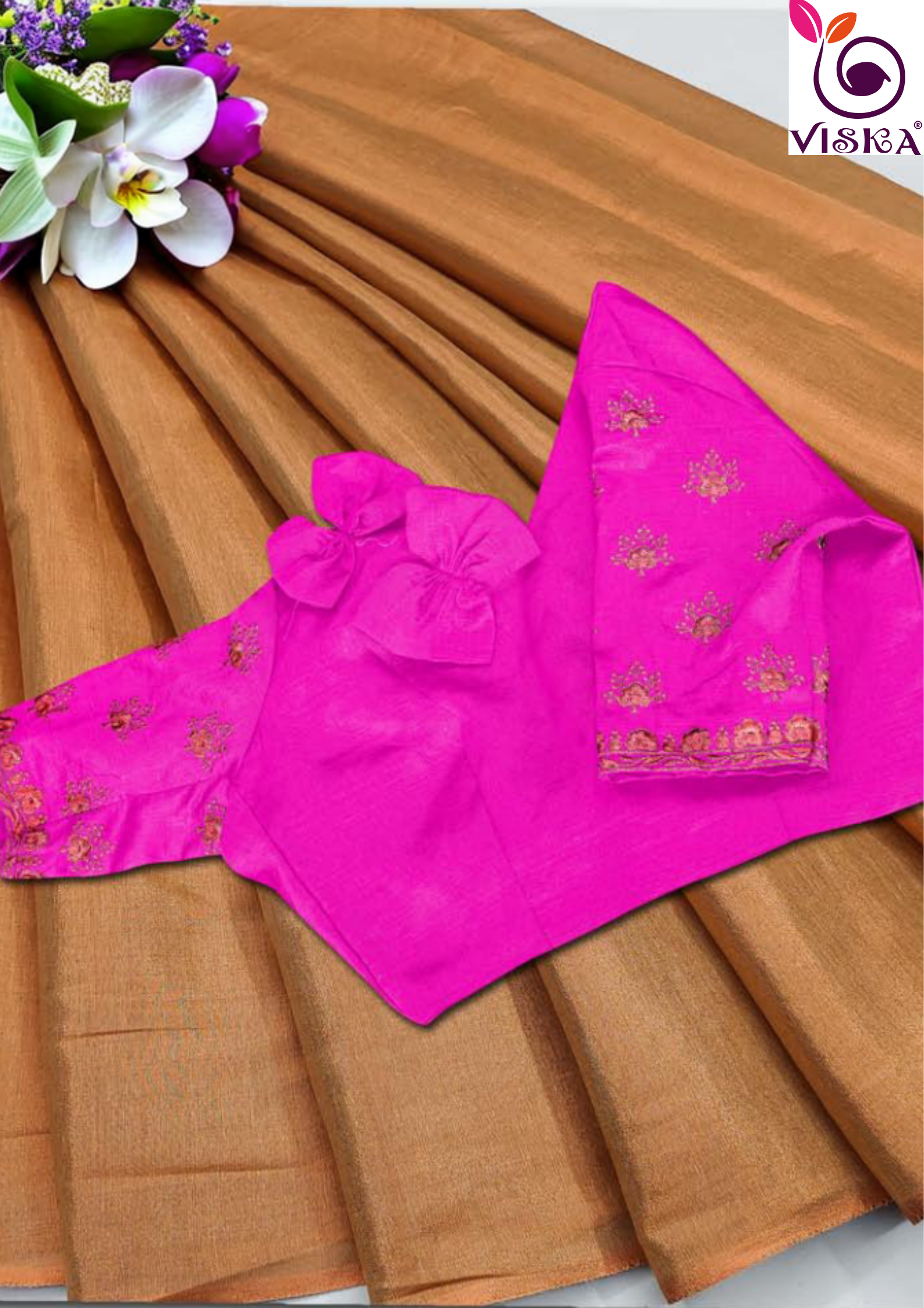 Viska's Copper Chiku Zari Saree features a plain design with intricate embroidery work on the unstitched blouse. The stunning saree is expertly crafted with copper zari, adding a touch of elegance to its beautiful color.