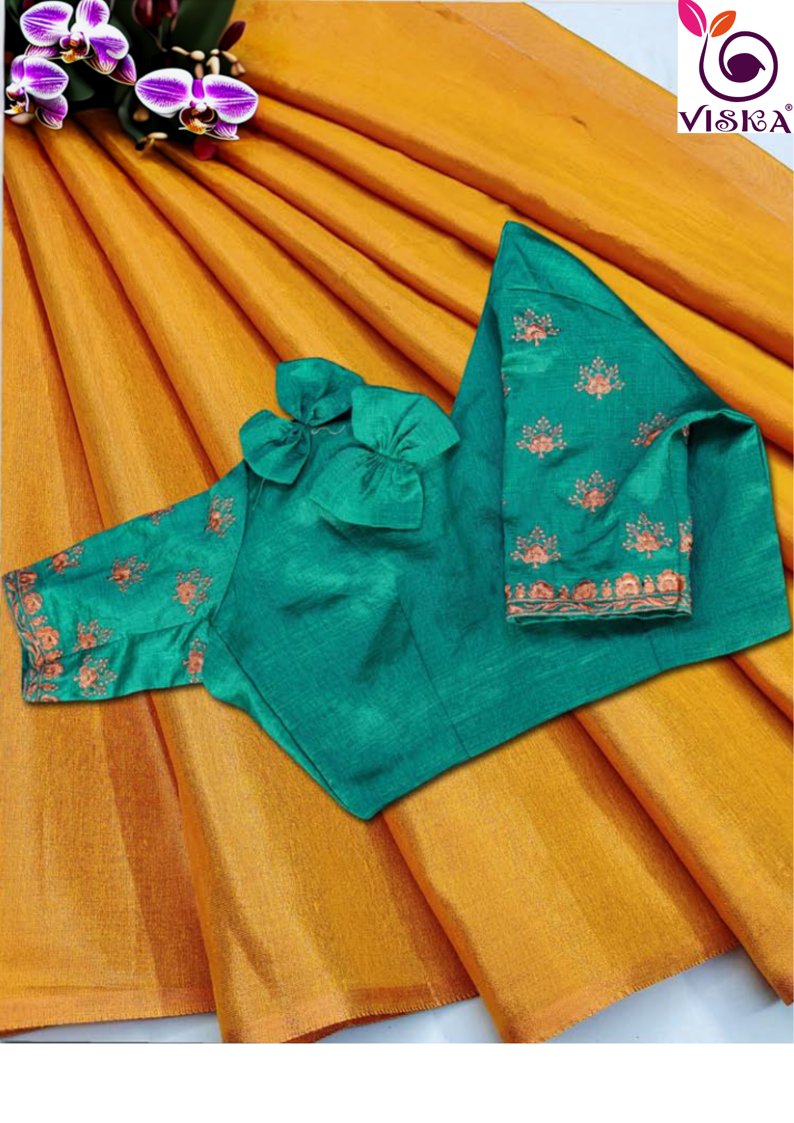 Viska's Copper Gold Zari Saree features a plain design with intricate embroidery work on the unstitched blouse. The stunning saree is expertly crafted with copper zari, adding a touch of elegance to its beautiful color.