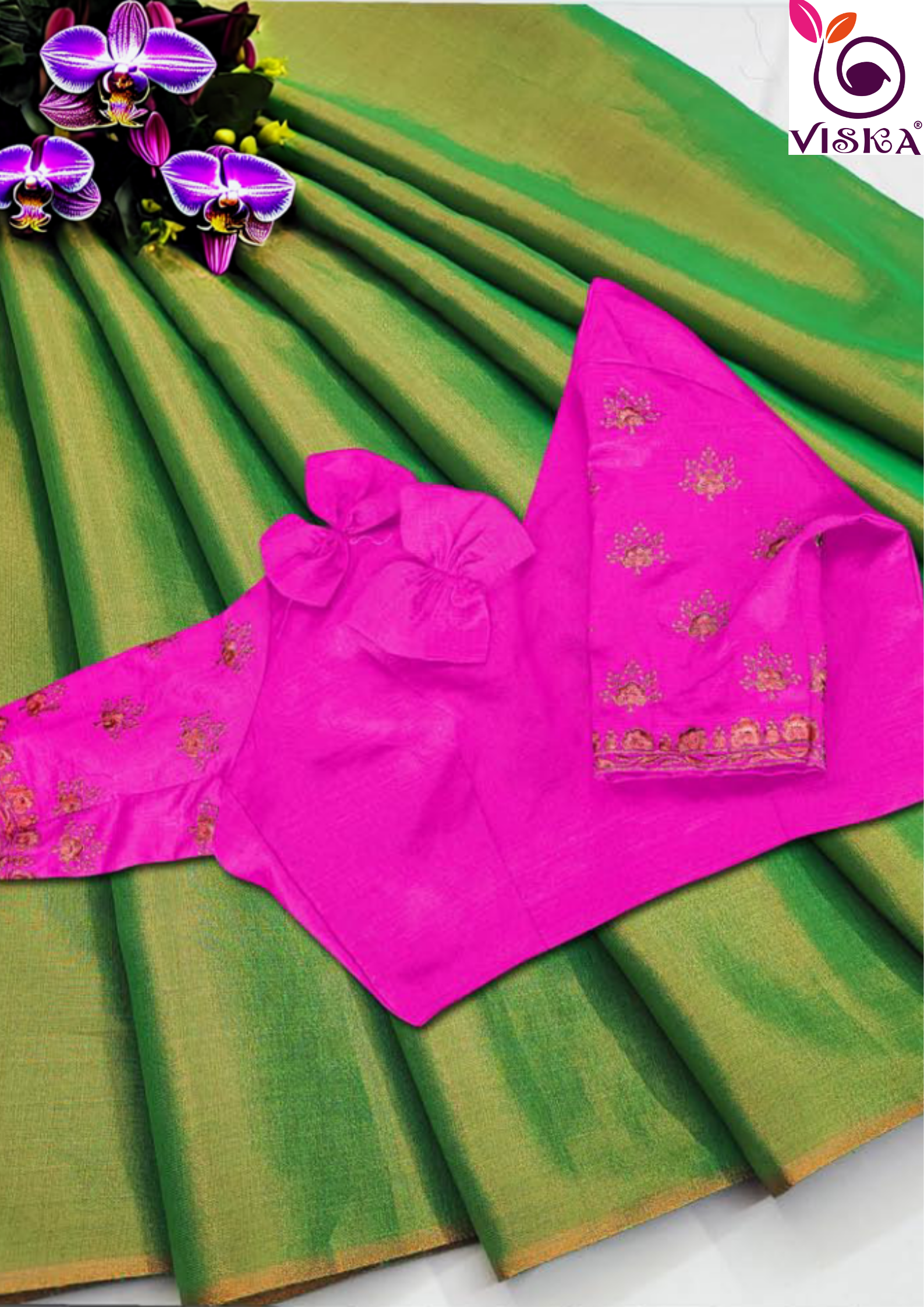 Viska's Copper Parrot Green Zari Saree features a plain design with intricate embroidery work on the unstitched blouse. The stunning saree is expertly crafted with copper zari, adding a touch of elegance to its beautiful color.