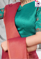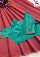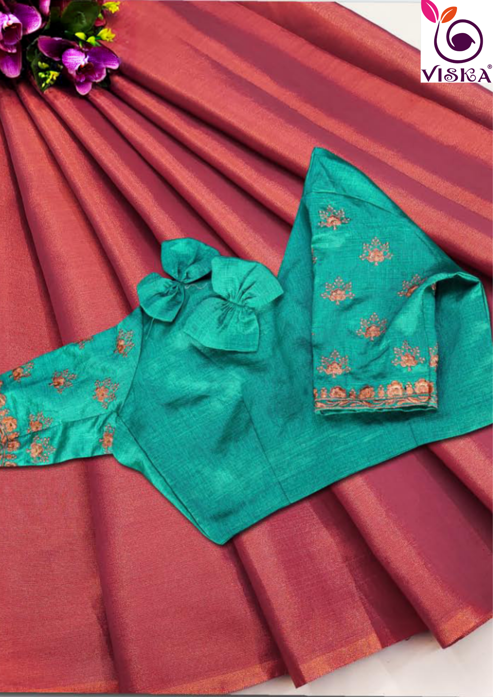 Viska's Copper Rani color Zari Saree features a plain design with intricate embroidery work on the unstitched blouse. The stunning saree is expertly crafted with copper zari, adding a touch of elegance to its beautiful color.