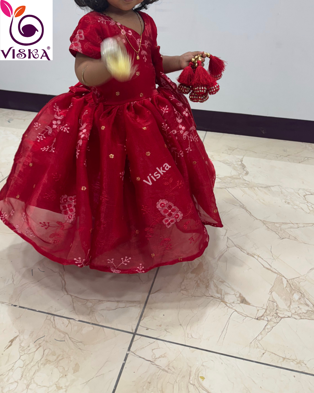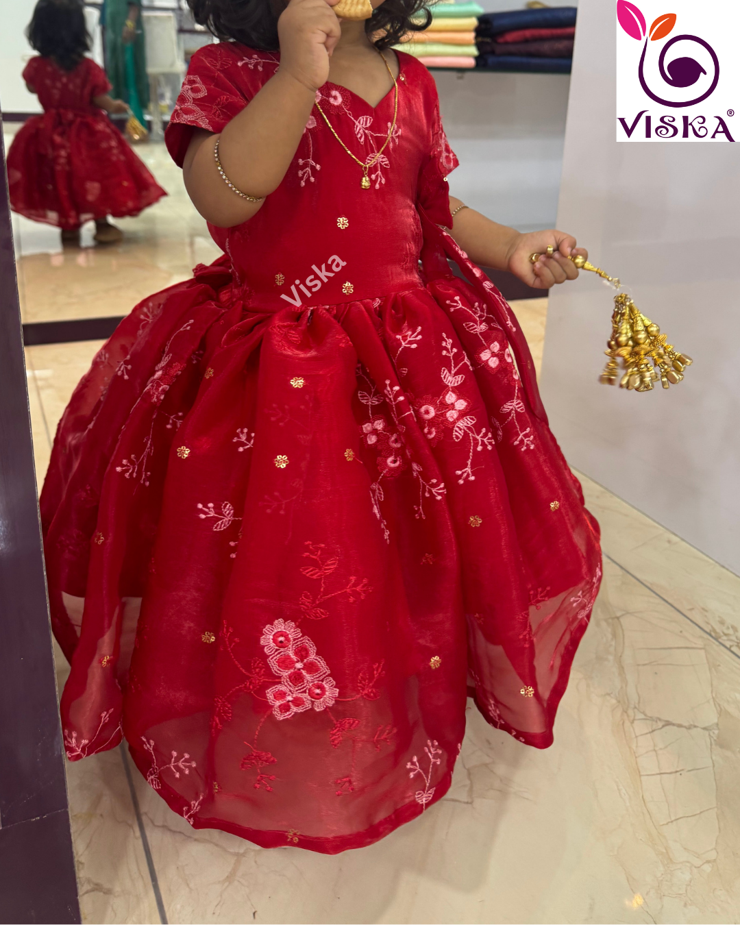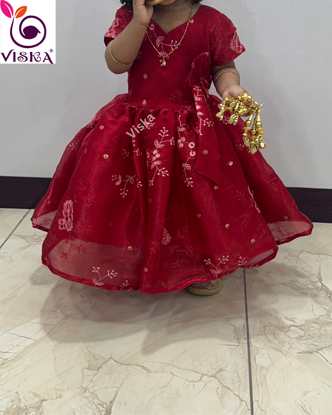 Transform your child's style with Viska's designer frock in Red with embroidery work. This frock is perfect for your little one for any special occasion.