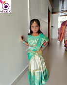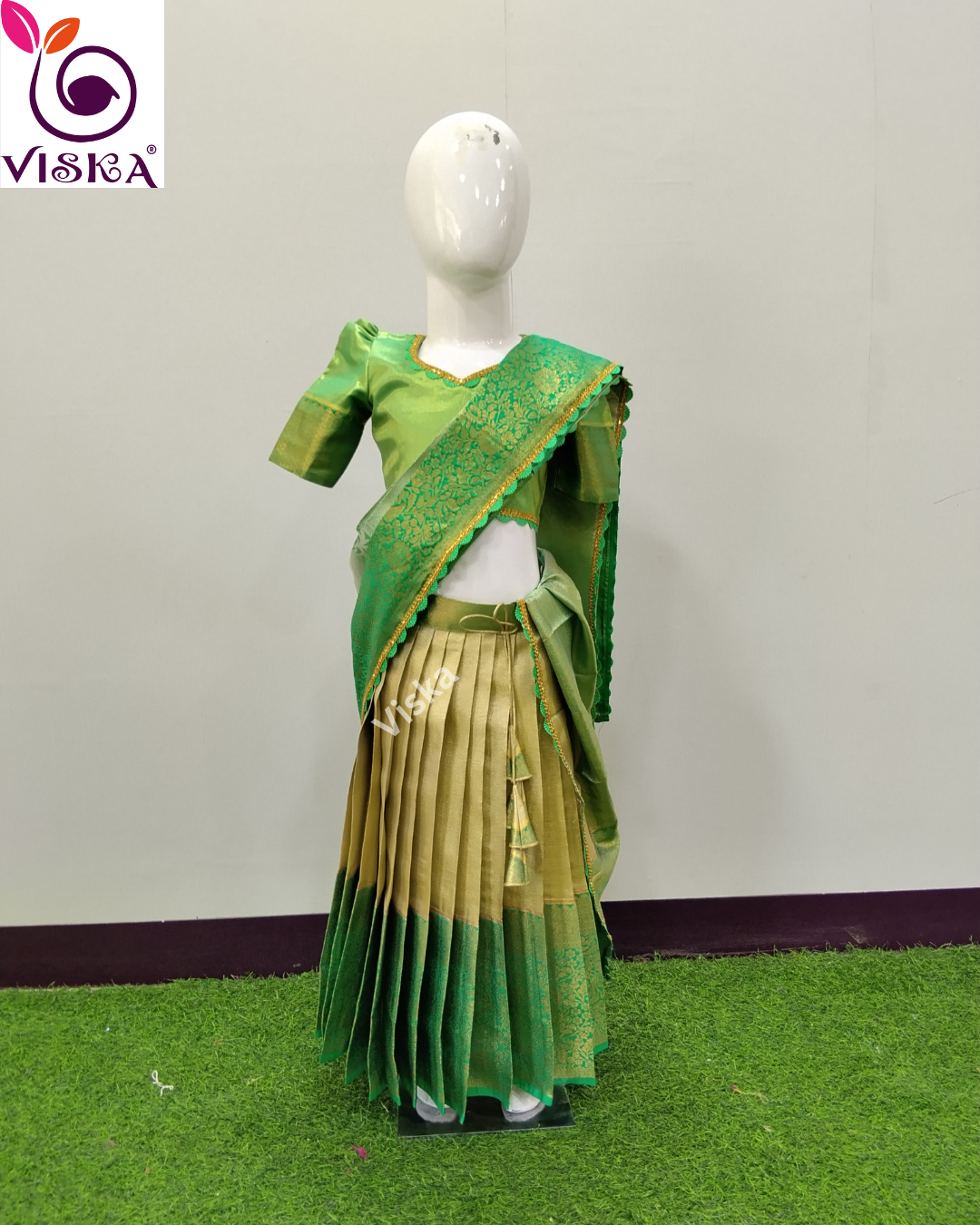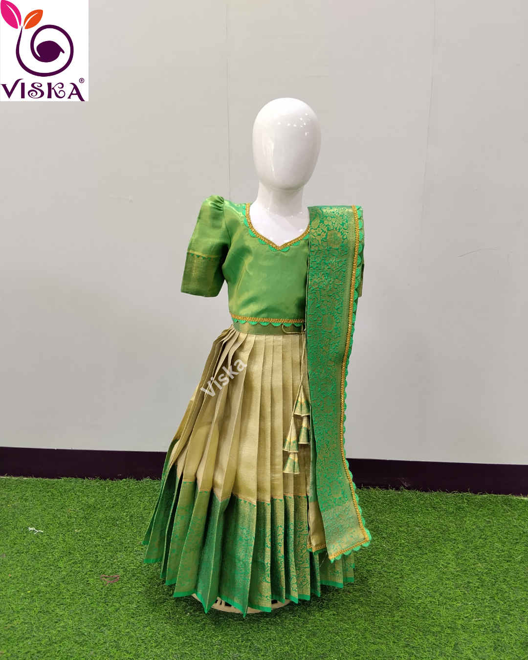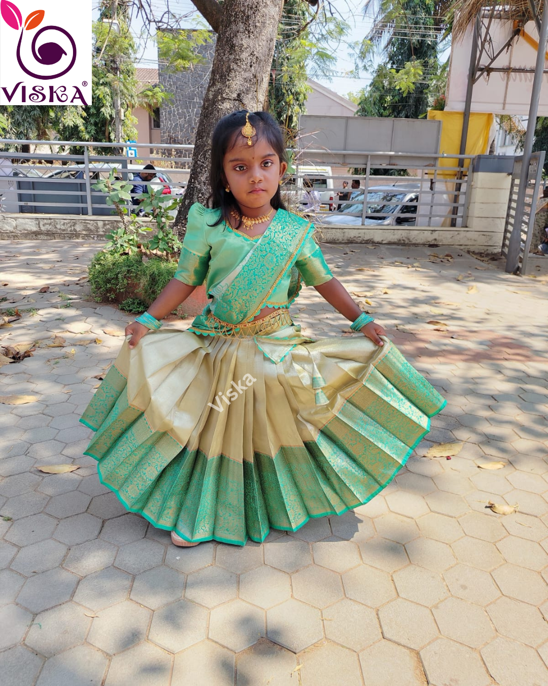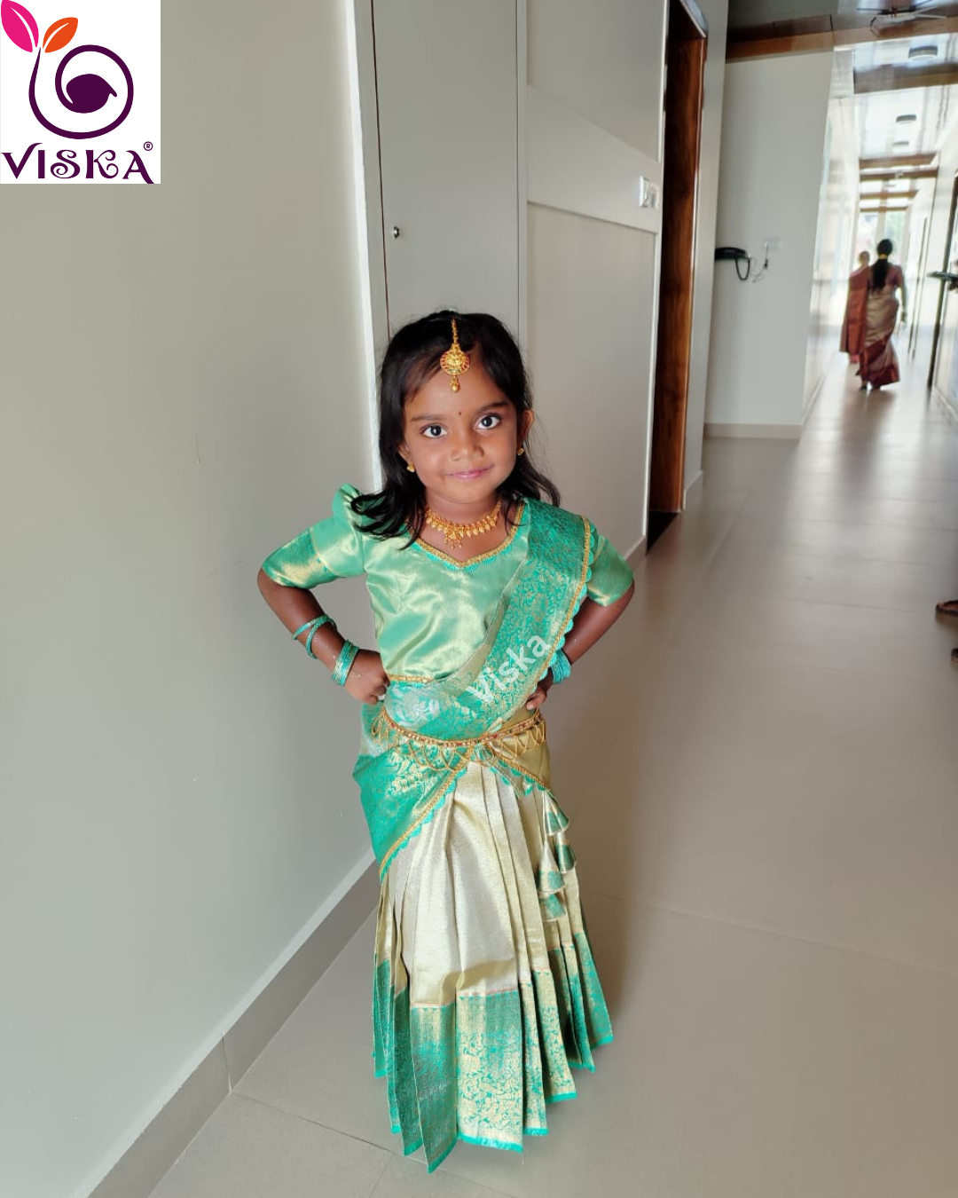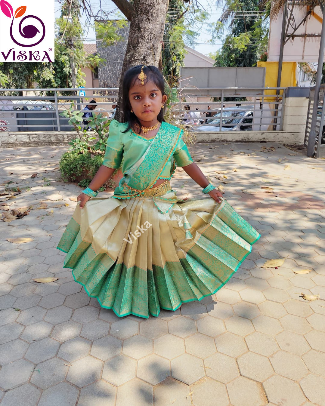 Transform your child's style with Viska's designer Silk Lehenga in Gold and Green. This Lehenga is perfect for your little one for any special occasion.