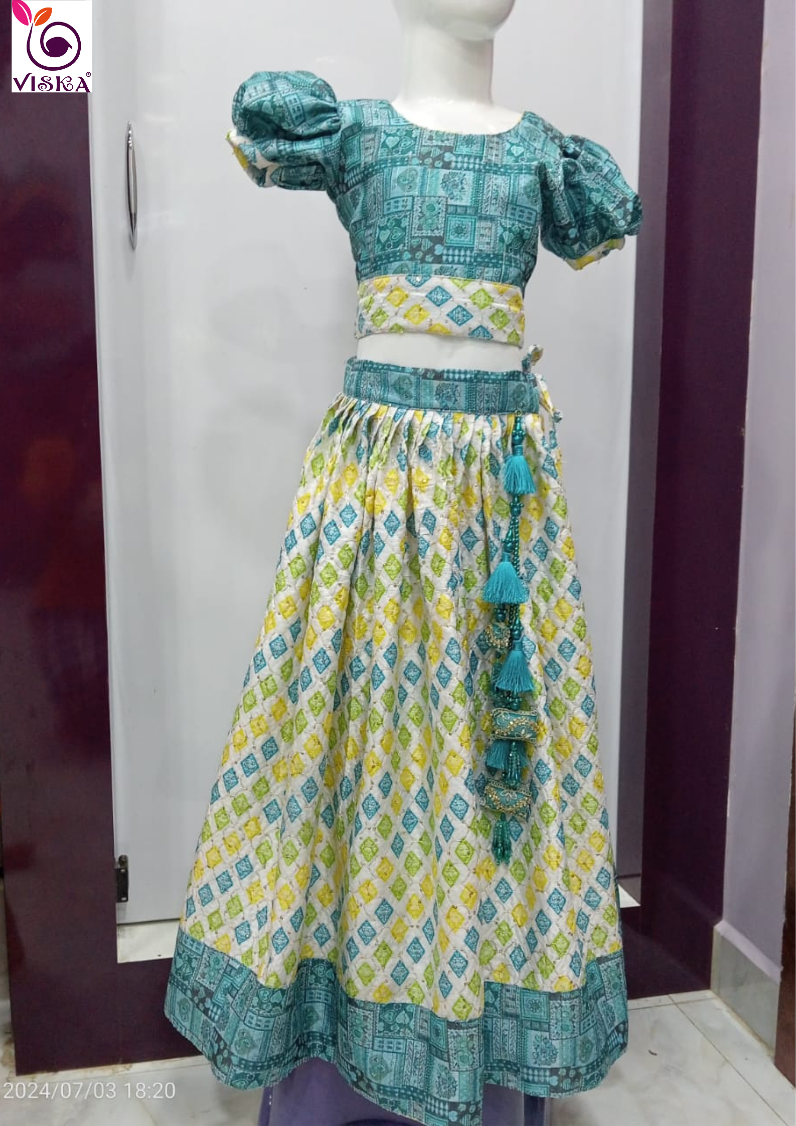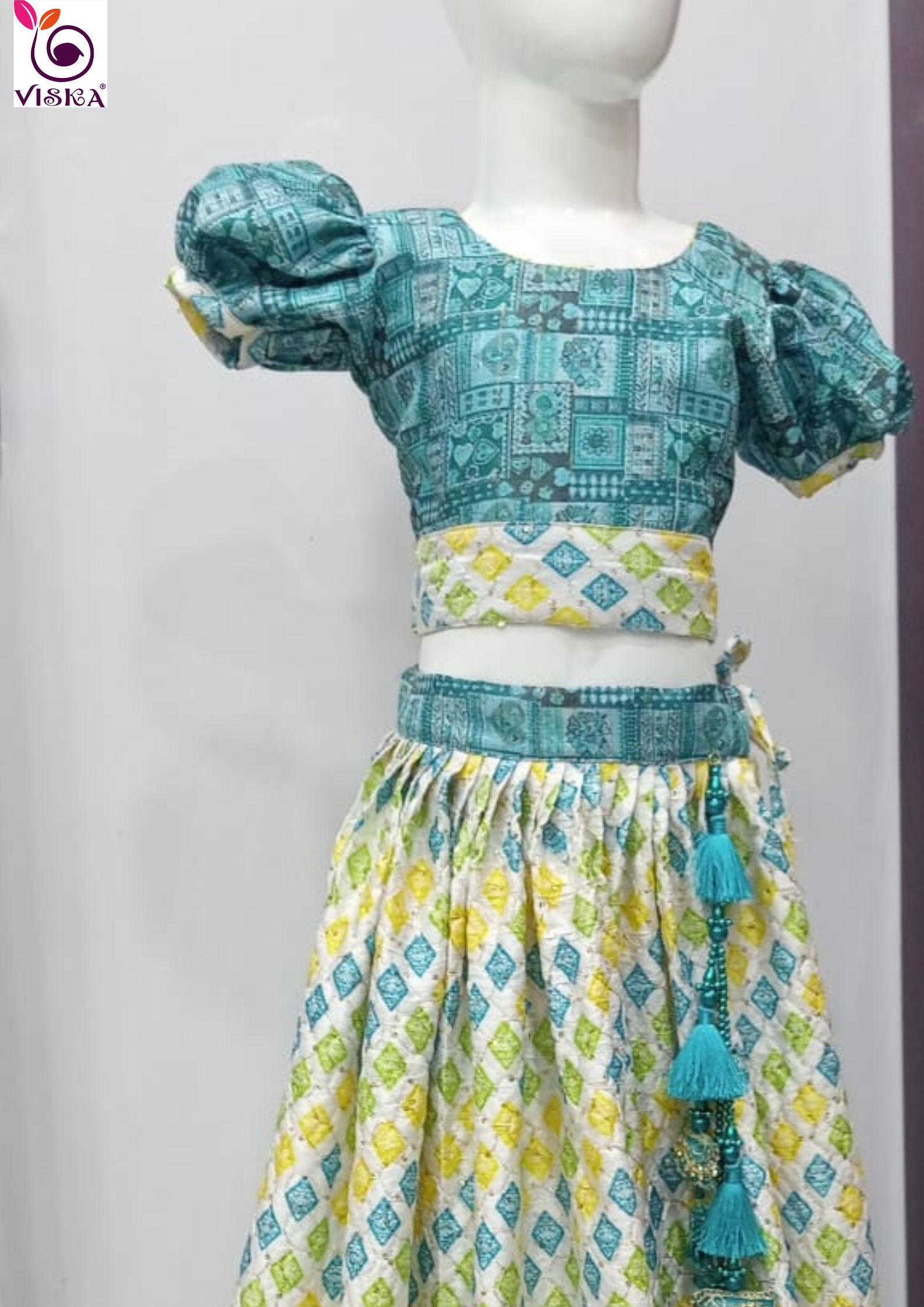 Get your little one ready for any special occasion with Viska's Traditional Beauty Kids Lehenga. This stunning lehenga comes with a contrast designer blouse, featuring a design sleeves for an elegant touch. Perfect for traditional events and celebrations, this set will make your child stand out with its stylish and sophisticated design.